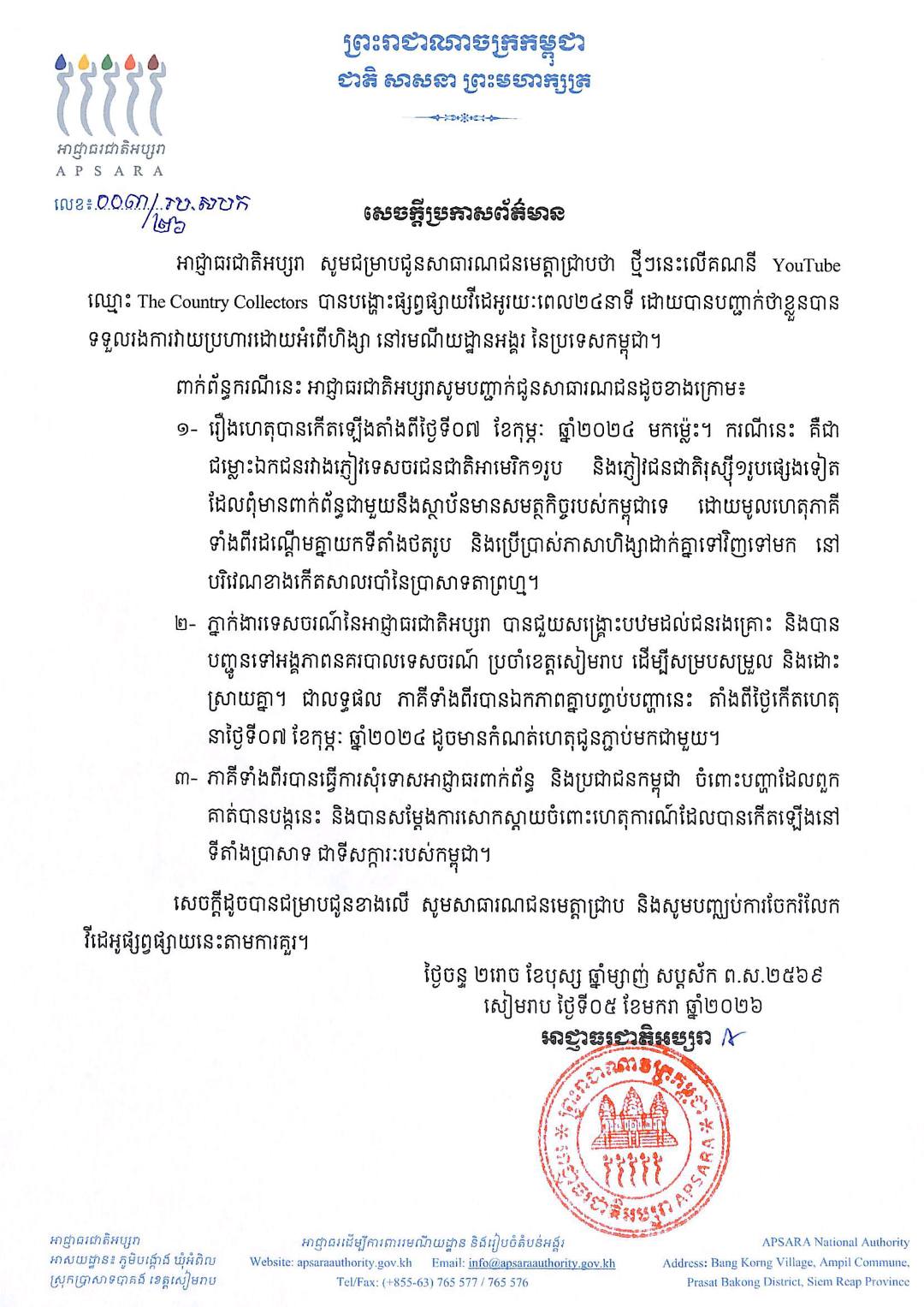 ខេត្តសៀមរាប ៖ សេចក្តីប្រកាសព័ត៌មានរបស់អាជ្ញាធរជាតិអប្សរា នៅថ្ងៃទី០៥ មករា ២០២៥នេះ បានឲ្យដឹងថា ថ្មីៗនេះលើគណនី YouTube ឈ្មោះ…