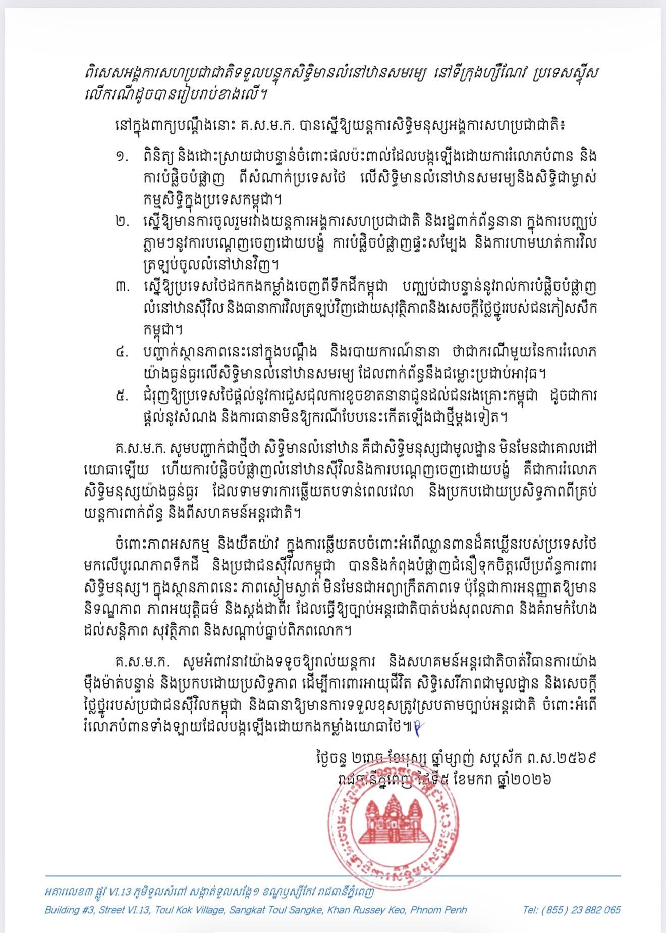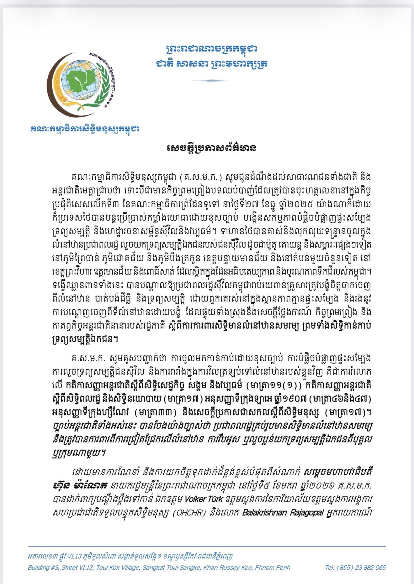 សេចក្តីប្រកាសព័ត៌មានរបស់គណៈកម្មាធិការសិទ្ធិមនុស្សកម្ពុជាចេញផ្សាយ នៅថ្ងៃទី៥ មករា ឆ្នាំ២០២៦បានលើកឡើងថា ទោះបីជាមានកិច្ចព្រមព្រៀងបទឈប់បាញ់ ដែលត្រូវបានចុះហត្ថលេខា នៅក្នុងកិច្ច ប្រជុំពិសេសលើកទី៣ នៃគណៈកម្មាធិការព្រំដែនទូទៅ នាថ្ងៃទី២៧ ខែធ្នូ ឆ្នាំ២០២៥ យ៉ាងណាក៏ដោយ ក៏ប្រទេសថៃ បានបន្តប្រើប្រាស់កម្លាំងយោធាដោយខុសច្បាប់បង្កើនសកម្មភាពបំផ្លិចបំផ្លាញផ្ទះសម្បែង ទ្រព្យសម្បត្តិ និងហេដ្ឋារចនាសម្ព័ន្ធស៊ីវិលនិងវប្បធម៌ ។