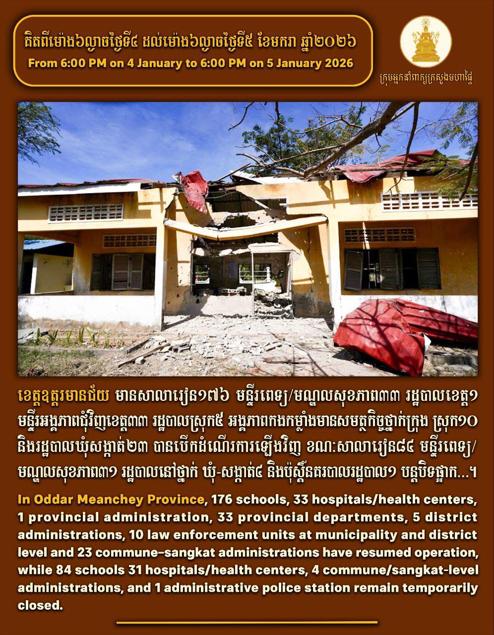 ជាក់ស្តែង ក្រសួងមហាផ្ទៃបានប្រកាសនៅលើបណ្តាញសង្គម នាព្រឹកថ្ងៃទី០៦ ខែមករា ឆ្នាំ២០២៦នេះថា ៖ គិតពីម៉ោង៦ល្ងាច ថ្ងៃទី៤ ដល់ម៉ោង៦ល្ងាច ថ្ងៃទី៥ ខែមករា ឆ្នាំ២០២៦ ខេត្តឧត្តរមានជ័យ មានសាលារៀន១៧៦ មន្ទីរពេទ្យ/មណ្ឌលសុខភាព៣៣ រដ្ឋបាលខេត្ត១ មន្ទីរអង្គភាពជុំវិញខេត្ត៣៣ រដ្ឋបាលស្រុក៥ អង្គភាពកងកម្លាំងមានសមត្ថកិច្ចថ្នាក់ក្រុង ស្រុក១០ និងរដ្ឋបាលឃុំសង្កាត់២៣ បានបើកដំណើរការឡើងវិញ ខណៈសាលារៀន៨៤ មន្ទីរពេទ្យ/មណ្ឌលសុខភាព៣១ រដ្ឋបាលនៅថ្នាក់ ឃុំ-សង្កាត់៤ និងប៉ុស្តិ៍នគរបាលរដ្ឋបាល១ បន្តបិទផ្អាក…។
