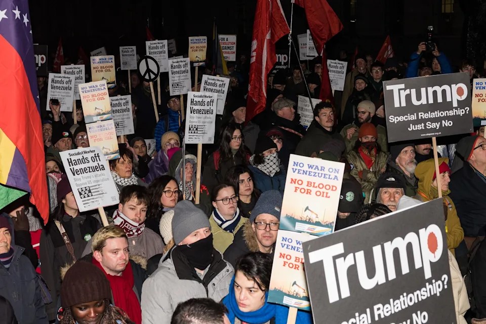 ពួកបាតុករនាំគ្នាដើរហែក្បួនដោយលើកប៉ង់កាតដែលសរសេរថា ត្រាំ-ម៉ាកូរ៉ូប៊ីយ៉ូសុទ្ធតែជាឃាតករនិងជាអ្នកចាប់ពង្រត់ ។ តើឯណាទៅយុត្តិធម៌ពិតប្រាកដនៅសហរដ្ឋអាមេរិក? គ្មានការបង្ហូរឈាមដើម្បីដណ្ដើមប្រេងឡើយ ។ ពាក្យនោះ ចង់និយាយសំដៅលើបំណងរបស់លោកត្រាំដណ្ដើមយកធនធានប្រេងដែលសម្បូរបែបរបស់វេណេស៊ុយអេឡា។ លោកត្រាំនិយាយថានឹងកាន់កាប់វេណេស៊ុយអេឡាគ្មានកាលកំណត់ ហើយនឹងគ្រប់គ្រងធនធានប្រេងដ៏មហាសាលរបស់ប្រទេសនេះ។