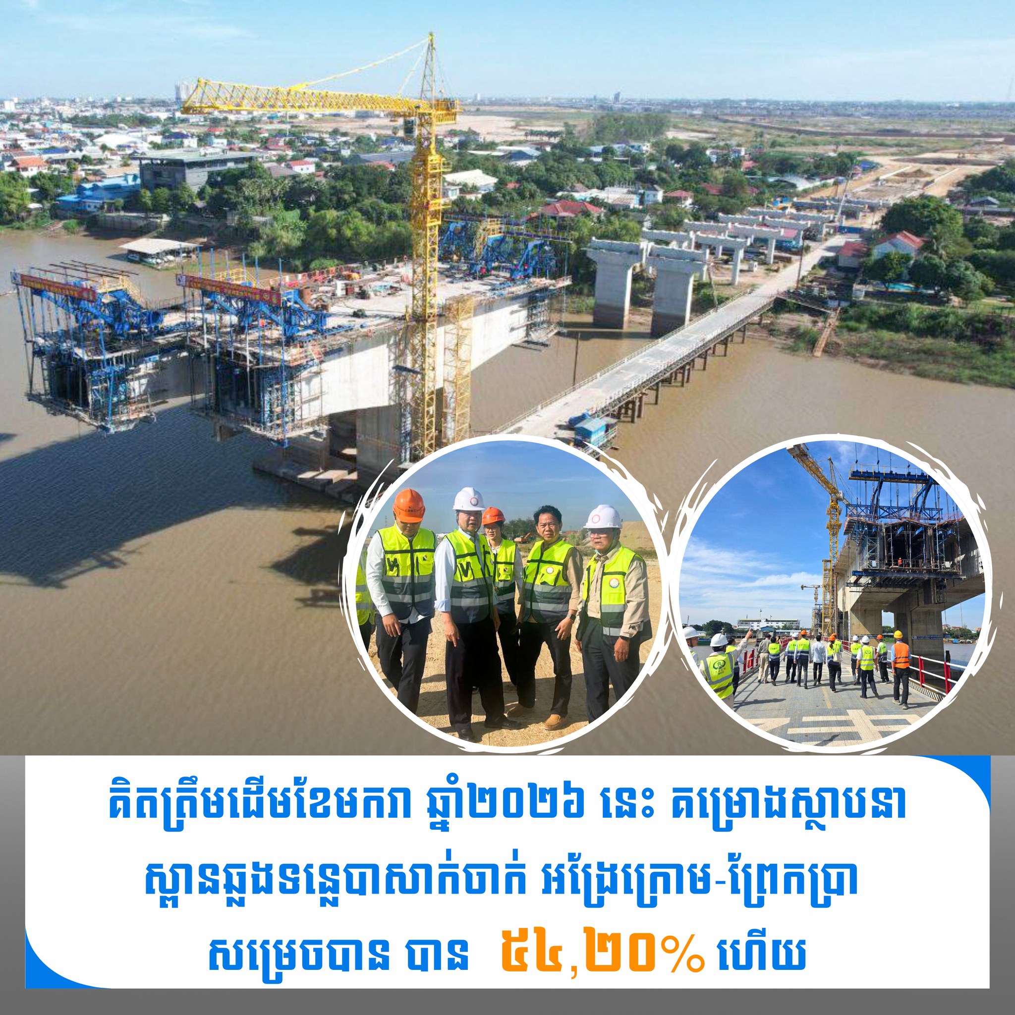 ជាក់ស្តែង នាថ្ងៃទី៦ ខែមករា ឆ្នាំ២០២៦ អង្គភាពគ្រប់គ្រងគម្រោងសាងសង់ស្ពានឆ្លងទន្លេបាសាក់ចាក់អង្រែក្រោម-ព្រែកប្រា ដឹកនាំដោយឯកឧត្តម សួង ហេង រដ្ឋលេខាធិការ និងជានាយកគម្រោង ចុះពិនិត្យតាមដានការអនុវត្តគម្រោង ដែលគិតត្រឹមដើមខែមករា ឆ្នាំ២០២៦ នេះ សម្រេចបាន ៥៤,២០% ហើយ បន្ទាប់ពីសម្ពោធបើកការដ្ឋានសាងសង់នាថ្ងៃទី១៩ ខែកុម្ភៈ ឆ្នាំ២០២៤ ក្រោមអធិបតីភាពដ៏ខ្ពង់ខ្ពស់របស់សម្តេចមហាបវរធិបតី ហ៊ុន ម៉ាណែត នាយករដ្ឋមន្ត្រី នៃព្រះរាជាណាចក្រកម្ពុជា ។