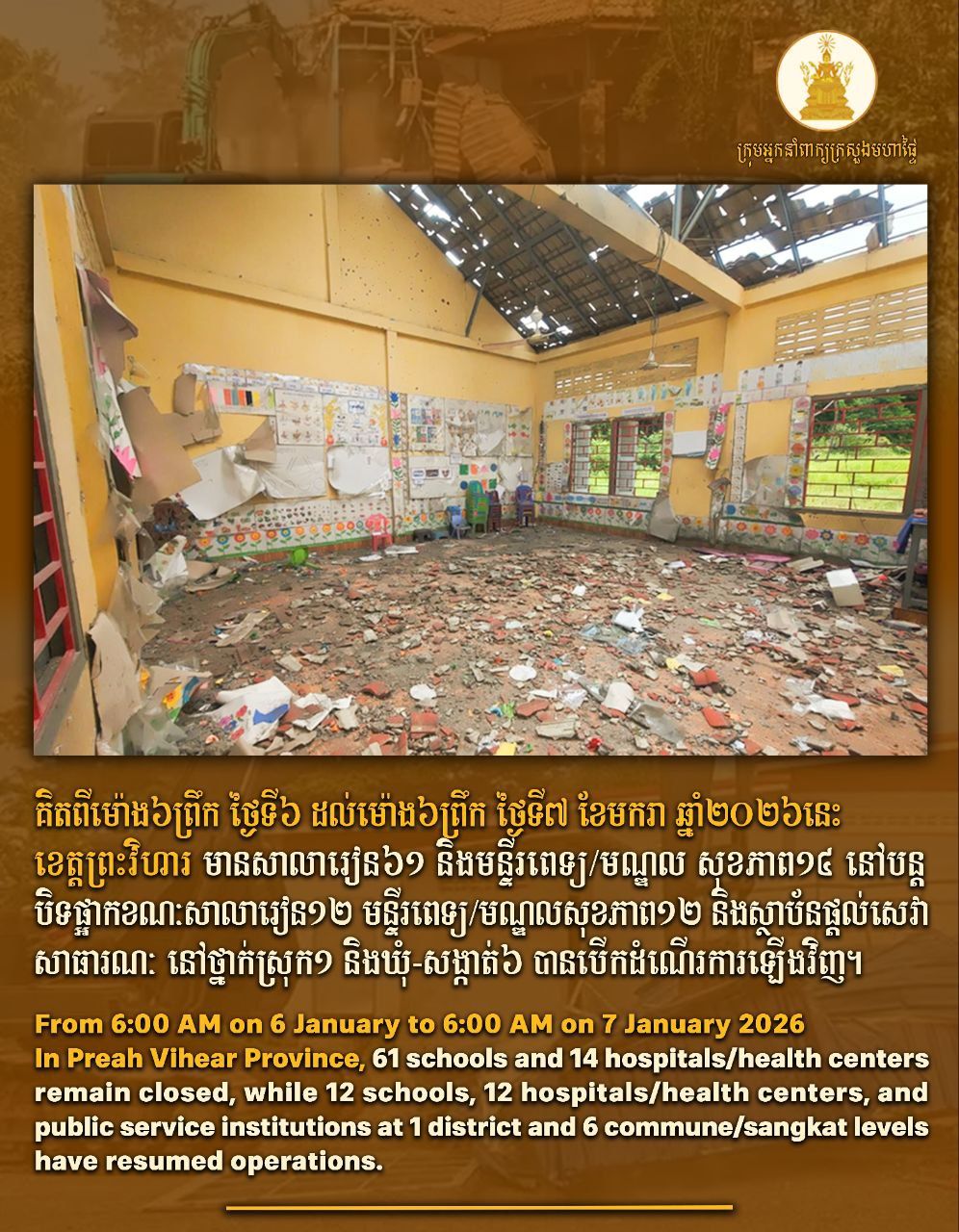ក្រសួងមហាផ្ទៃ បានប្រកាស នាល្ងាចថ្ងៃទី០៧ ខែមករា ឆ្នាំ២០២៦នេះថា ៖ គិតពីម៉ោង៦ព្រឹក ថ្ងៃទី៦ ដល់ម៉ោង៦ព្រឹក ថ្ងៃទី៧ ខែមករា ឆ្នាំ២០២៦នេះ ខេត្តព្រះវិហារ មានសាលារៀន៦១ និងមន្ទីរពេទ្យ/មណ្ឌល សុខភាព១៤ នៅបន្តបិទផ្អាក ខណៈសាលារៀន១២ មន្ទីរពេទ្យ/មណ្ឌលសុខភាព១២ និងស្ថាប័នផ្តល់សេវាសាធារណៈ នៅថ្នាក់ស្រុក១ និងឃុំ-សង្កាត់៦ បានបើកដំណើរការឡើងវិញ ។
