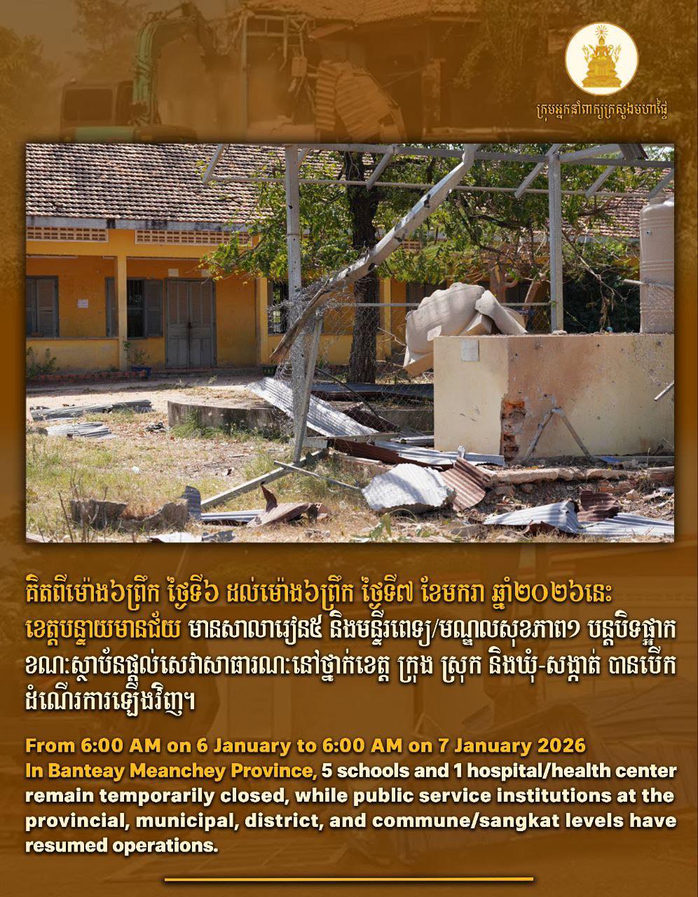 យោងតាមការប្រកាសរបស់ក្រសួងមហាផ្ទៃ នាថ្ងៃទី០៧ ខែមករា ឆ្នាំ២០២៦ បានឱ្យដឹងថា ស្ថានភាពនៃគ្រឹះស្ថានសិក្សា និងមណ្ឌលសុខភាពក្នុងខេត្តចំនួនពីរ មានការប្រែប្រួលដូចខាងក្រោម ៖