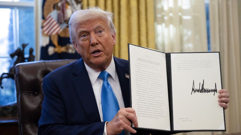 US President Donald Trump shows an executive order withdrawing his country from a number of United Nations bodies in the Oval Office of the White House on February 4, 2025 in Washington, DC. Trump on Tuesday signed an executive order withdrawing his country from a number of United Nations bodies, including its Human Rights Council (UNHRC), and setting up a broader review of US funding for the multilateral organization. The executive order said it withdrew Washington from UNHRC and the main UN relief agency for Palestinians (UNRWA), and would review involvement in the United Nations Educational, Scientific and Cultural Organization (UNESCO). (Photo by ANDREW CABALLERO-REYNOLDS / AFP)