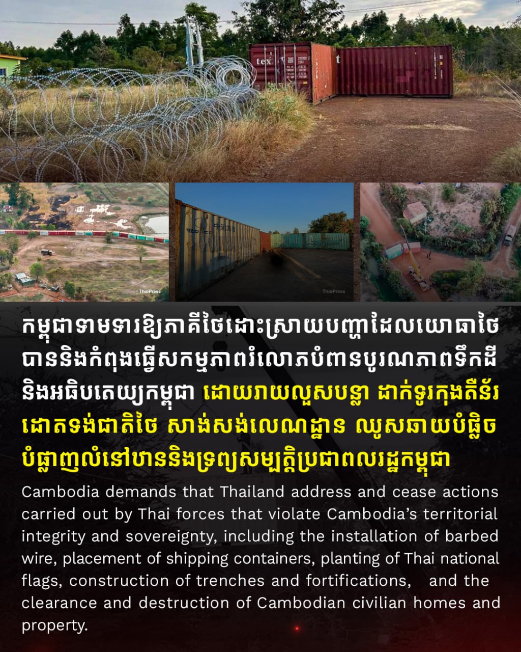 រាជធានីភ្នំពេញ ៖ កម្ពុជាទាមទារឱ្យភាគីថៃដោះស្រាយបញ្ហាដែលយោធាថៃបាន និងកំពុងធ្វើសកម្មភាពរំលោ.ភបំពានបូរណភាពទឹកដី និងអធិបតេយ្យកម្ពុជា ដោយរាយលួសបន្លា ដាក់ទូរកុងតឺន័រ ដោតទង់ជាតិថៃ សាង់សង់លេណដ្ឋាន ឈូសឆាយបំផ្លិចបំផ្លាញលំនៅឋាន និងទ្រព្យសម្បត្តិប្រជាពលរដ្ឋកម្ពុជា ។ នេះបើយោងតាម Press OCM – អង្គភាពព័ត៌មាន និងប្រតិកម្មរហ័ស បានប្រកាសនាម៉ោងជាង១១ព្រឹកថ្ងៃទី០៨ ខែមករា ឆ្នាំ២០២៦ ។