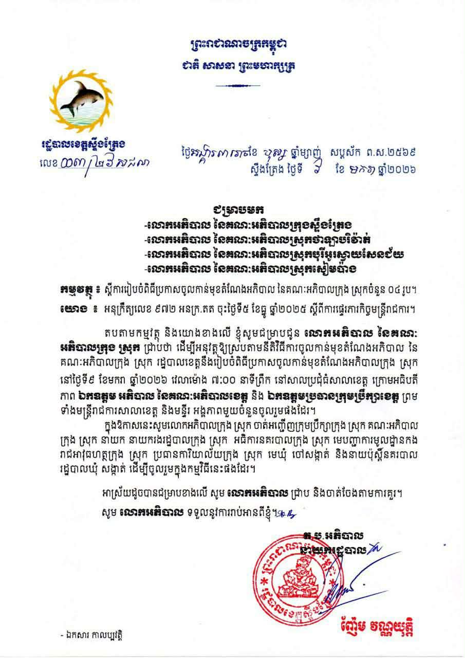 ខេត្តស្ទឹងត្រែង ៖ បើពុំមានការប្រែប្រួលទេ នាព្រឹកថ្ងៃទី៩ ខែមករា ឆ្នាំ២០២៦ ស្អែកនេះ នៅសាលប្រជុំរដ្ឋបាលខេត្ត និងរៀបចំពិធីប្រកាសចូលកាន់មុខតំណែងអភិបាល នៃគណៈអភិបាលក្រុង ស្រុក ចំនួន៤រូប ។