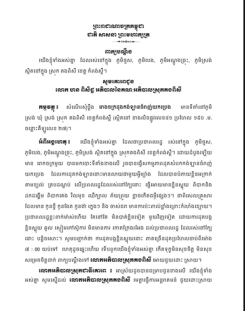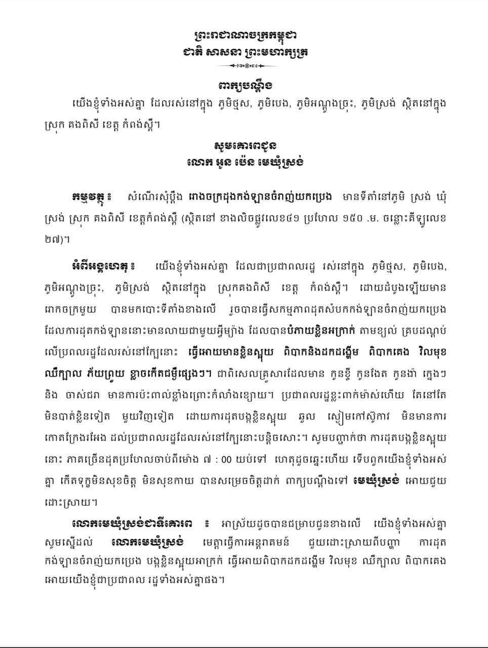 ខេត្តកំពង់ស្ពឺ៖ ប្រជាពលរដ្ឋចំនួន៤ភូមិ ក្នុងឃុំស្រង់ ស្រុកគងពិសី ខេត្តកំពង់ស្ពឺ បានលើកគ្នាសុំឱ្យអាជ្ញាធរឃុំស្រង់ ជាពិសេស លោក ហន ពិសិដ្ឋ អភិបាល នៃគណៈអភិបាលស្រុកគងពិសី ជួយហិតក្លិន និងអន្តរាគមន៍ ពាក់ព័ន្ធករណីរោងចក្រដុតកង់ឡាន ចម្រាញ់យកប្រេងមួយកន្លែង ដែលមានទីតាំង នៅភូមិស្រង់ ឃុំស្រង់ ស្រុកគងពិសី កំពុងបង្កផលប៉ះ ពាល់ដល់ការរស់នៅ និងសុខភាពរបស់ពួកគាត់។