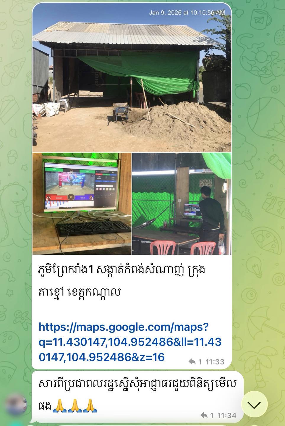ខេត្តកណ្តាល ៖ ក្រុមការងារព័ត៌មាន និងប្រតិកម្មរហ័សនៃអធិការដ្ឋាននគរបាលក្រុងតាខ្មៅ សូមជម្រាបជូនសាធារណជនថា អនុវត្តតាមបណ្តឹងរបស់ប្រជាពលរដ្ឋតាមបណ្តាញសង្គម ស្ដីពីការបើកល្បែងស៊ីសងអនឡាញខុសច្បាប់ លោកអធិការនគរបាលក្រុងតាខ្មៅ បានបញ្ជាឱ្យកម្លាំងប៉ុស្តិ៍នគរបាលរដ្ឋបាលកំពង់សំណាញ់ ចុះស្រាវជ្រាវ និងបង្ក្រាបជាបន្ទាន់ ។