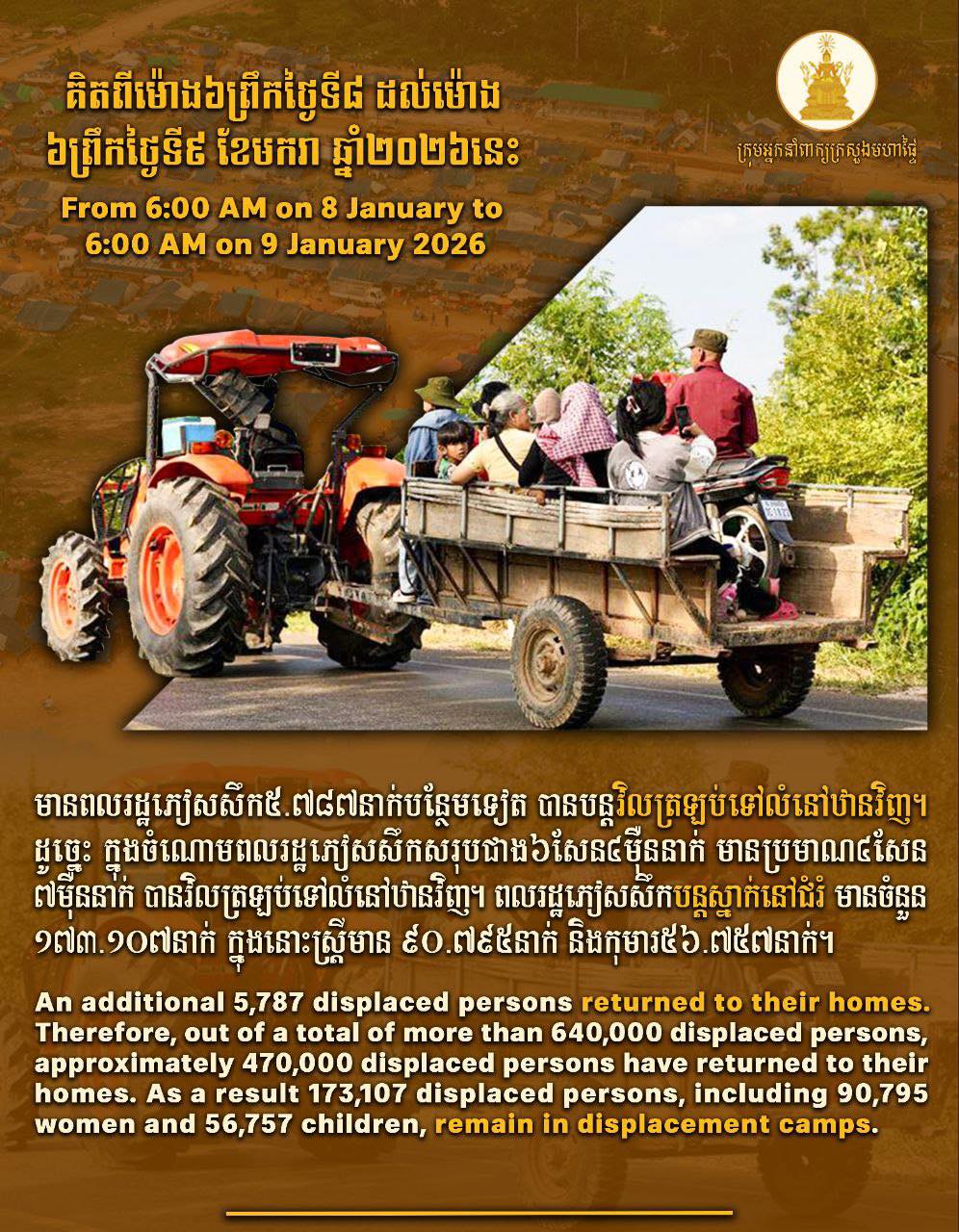 ជាក់ស្តែង ក្រសួងមហាផ្ទៃ បានប្រកាសនារសៀលថ្ងៃទី០៩ ខែមករា ឆ្នាំ២០២៦នេះថា ៖ គិតពីម៉ោង៦ព្រឹក ថ្ងៃទី៨ ដល់ម៉ោង៦ព្រឹក ថ្ងៃទី៩ ខែមករា ឆ្នាំ២០២៦នេះ មានពលរដ្ឋភៀសសឹក៥.៧៨៧នាក់បន្ថែមទៀត បានបន្តវិលត្រឡប់ទៅលំនៅឋានវិញ ។