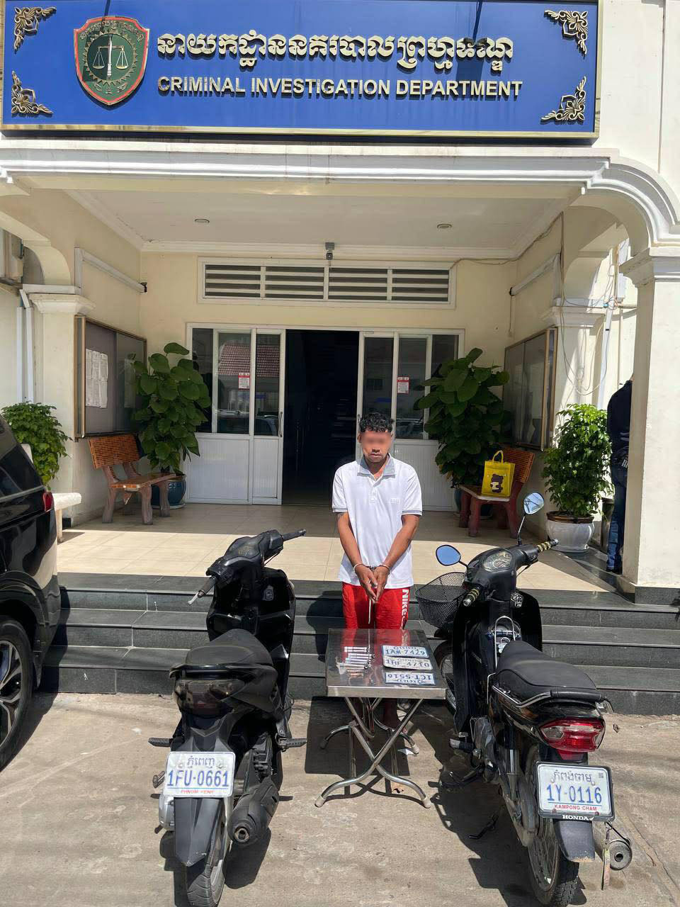 ជនសង្ស័យខាងលើមានឈ្មោះ សឿម សុភ័ក្ត្រ ភេទប្រុស អាយុ៣៦ឆ្នាំ ជនជាតិខ្មែរ ពាក់ព័ន្ធនឹងករណីលួចកាច់កម៉ូតូ ០៤គ្រឿង ម៉ាក Suzuki Nex ពណ៌ស ពាក់ស្លាកលេខ កំពង់ចាម ១Y-០១១៦, ម៉ាក Honda Beat ពណ៌ក្រហម ពាក់ស្លាកលេខ ព្រៃវែង១T-៥៧២៧, ម៉ាក Honda Dream ពណ៌ខ្មៅ ពាក់ស្លាកលេខ ១LW-៥៧២៧ និងម៉ាក Honda Dream ពណ៌ខ្មៅ ពាក់ស្លាកលេខ បន្ទាយមានជ័យ១V-៤៤៤២ កាលពីថ្ងៃទី២៨ ខែតុលា ឆ្នាំ២០២៥ នៅត្រង់ចំណុចបន្ទប់ជួល ក្នុងសង្កាត់កាកាបទី១ ខណ្ឌពោធិ៍សែនជ័យ រាជធានីភ្នំពេញ ។