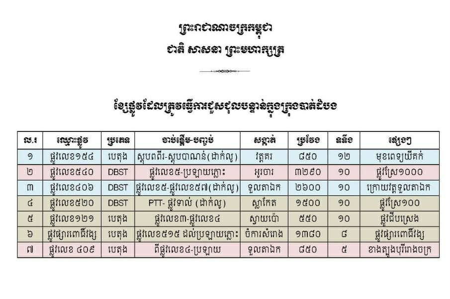 រួមមាន៖១-ផ្លូវលេខ១៥៤ចាក់«បេតុង» ចាប់ពីចំណុចស្តុបពេទ្យពពីរ ដល់ចំណុចស្ដុបបាណន់ (ដាក់លូ) ក្នុងសង្កាត់វត្តគរ ប្រវែង៨៥០ម៉ែត្រ ទទឹង១២ម៉ែត្រ (ផ្លូវមុខពេទ្យយីគក់) ។ ២-ផ្លូវលេខ៥៤០ ក្រាលកៅស៊ូ«DBST »ចាប់ពីផ្លូវជាតិលេខ៥ ដល់ប្រឡាយភ្លោះ ក្នុងសង្កាត់អូរចារ ដែលមានប្រវែង៣២៩០ម៉ែត្រ ទទឹង១០ម៉ែត្រ (ផ្លូវស្រែ១០០០) ។ ៣-ផ្លូវលេខ៤០៦ ក្រាលកៅស៊ូ«DBST» ចាប់ពីផ្លូវជាតិលេខ៥ ដល់ផ្លូវលេខ៥៧ (ដាក់លូ) ក្នុងសង្កាត់ទួលតាឯក ប្រវែង២៦០០ម៉ែត្រ ទទឹង១០ម៉ែត្រ (ផ្លូវក្រោយវត្តទួលតាឯក) ។ ៤-ផ្លូវលេខ៥២០ ក្រាលកៅដស៊ូ «DBST» ចាប់ពីស្ថានីយប្រេងPTT ដល់ផ្លូវទាល់ ក្នុងសង្កាត់ស្លាកែត ប្រវែង១៥០០ម៉ែត្រ ទទឹង១០ម៉ែត្រ(ផ្លូវស្រែ១០០) ។
