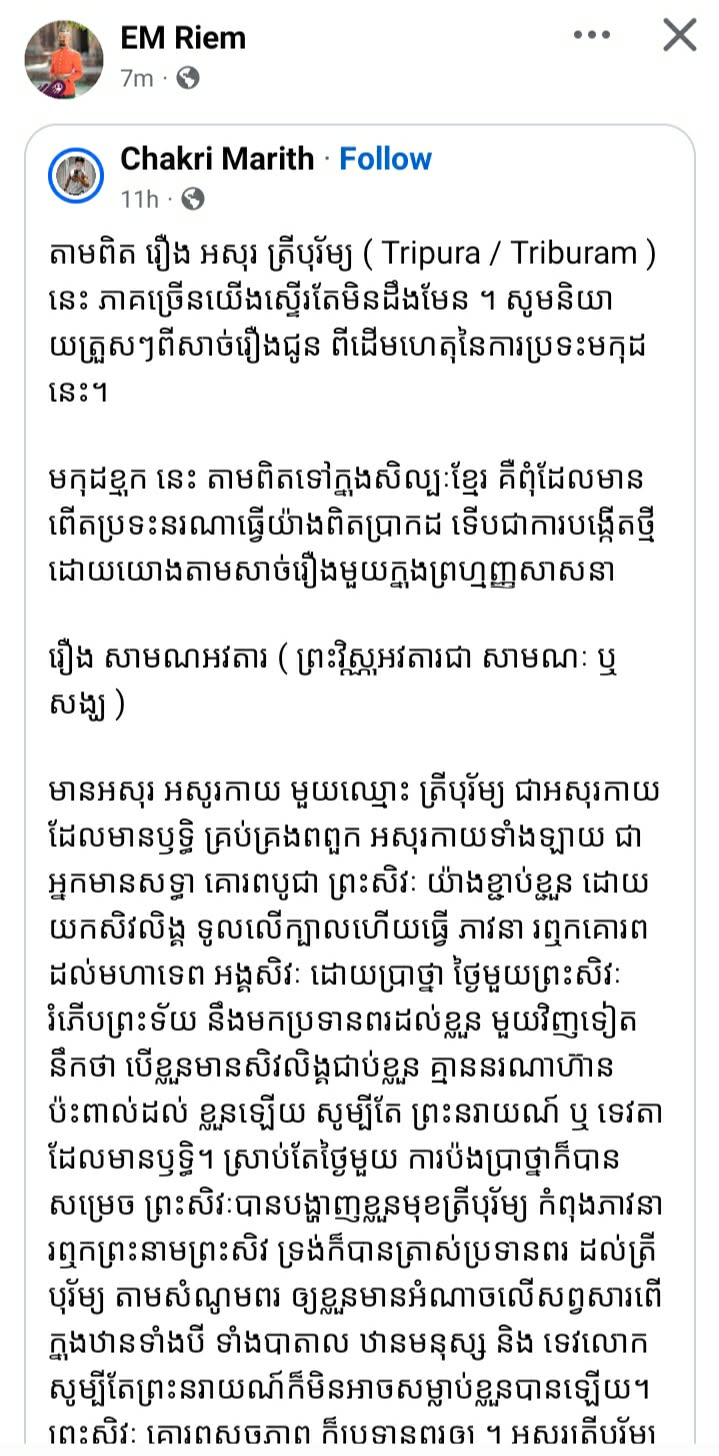ចំណែកគណនេយ្យឈ្មោះ Chakri Marith ក៏បានលើកឡើងពីសាច់រឿងត្រួសៗនៃដើមហេតុទាក់ទងទៅនឹងម្កុដរបស់លោក ឯម រៀម នាពេលនេះថា តាមពិត រឿងអសុរ ត្រីបុរ័ម្យ ( Tripura / Triburam ) នេះ ភាគច្រើនយើងស្ទើរតែមិនដឹងមែន ។ សូមនិយាយត្រួសៗពីសាច់រឿងជូន ពីដើមហេតុនៃការប្រទះមកុដនេះ ។