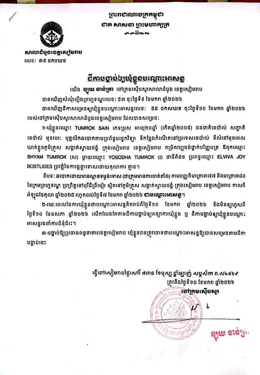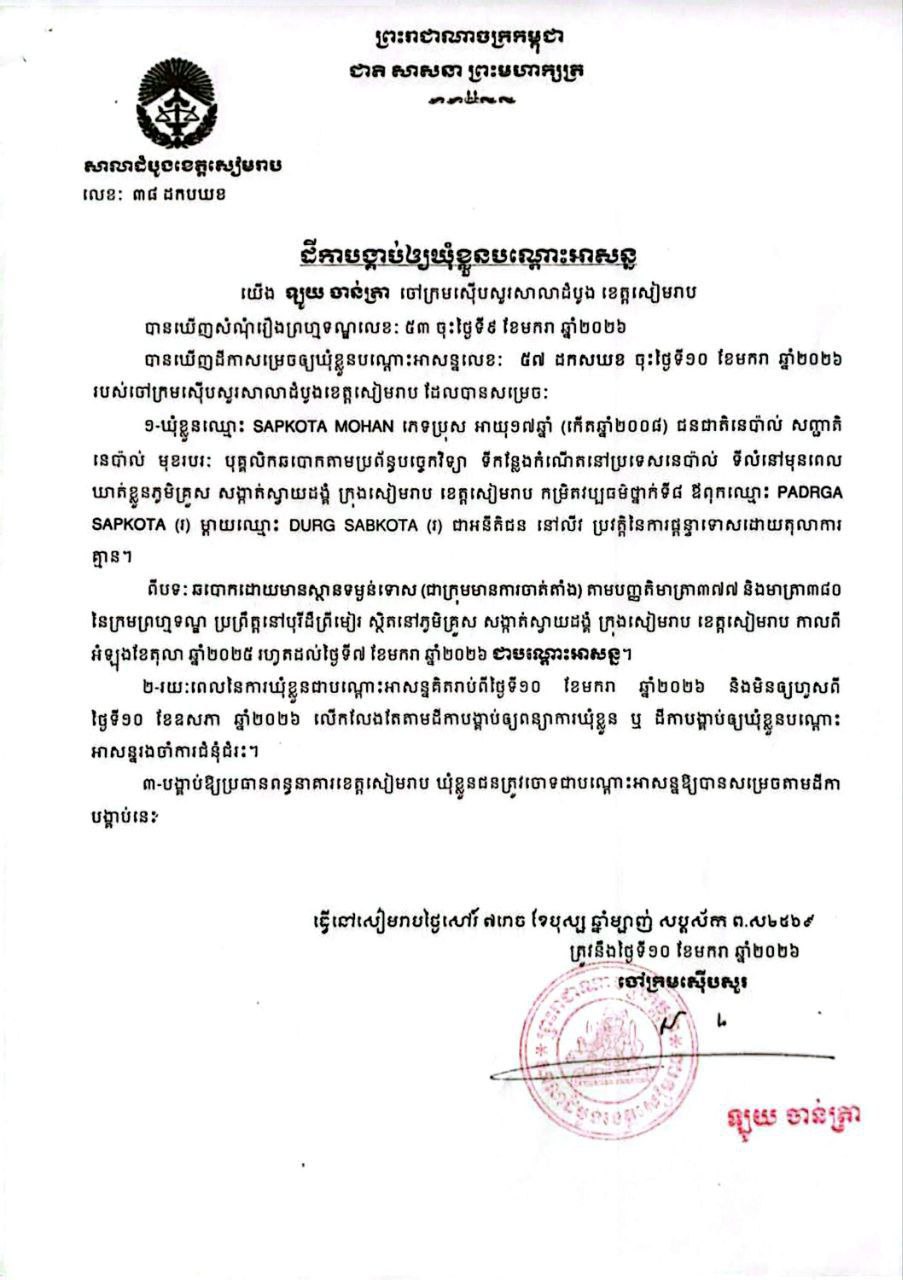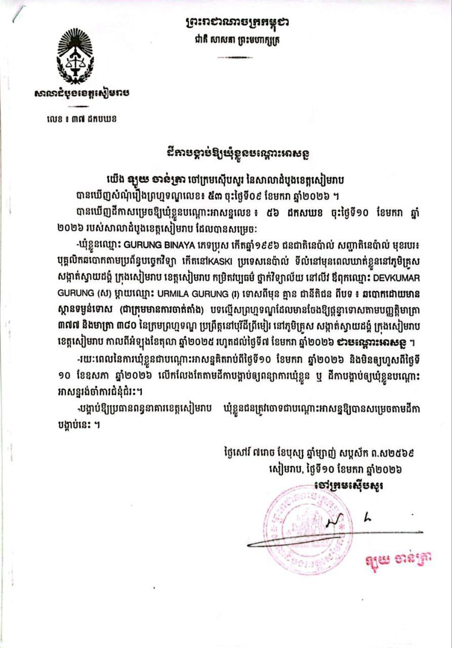 ខេត្តសៀមរាប ៖ សាលាដំបូងខេត្ត បានចេញដីកាបង្គាប់ឱ្យឃុំខ្លួនជនជាតិនេប៉ាល់ចំនួន