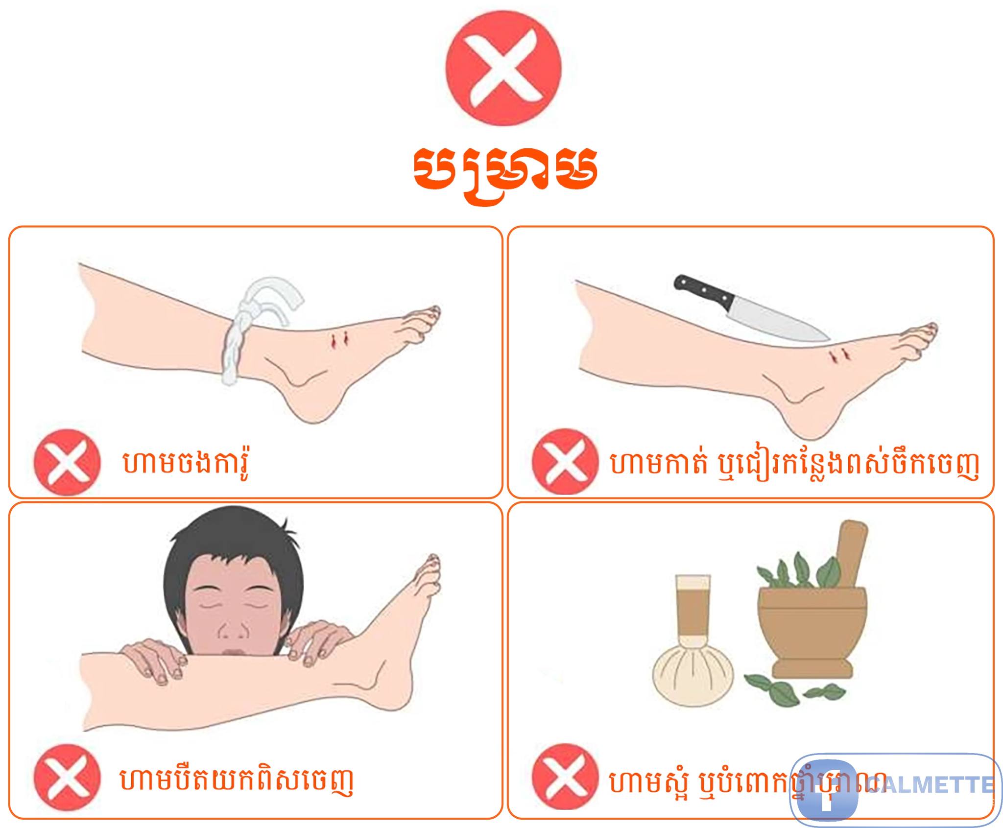 ប្រភពដដែលបានបន្តថា ជនរងគ្រោះ គឺហាមលើកដៃ ឬជើង កន្លែងពស់ចឹកខ្ពស់ជាងបេះដូង ហើយ លាងសម្អាតមុខរបួសកន្លែងពស់ចឹកដោយសាប៊ូ និងទឹក ឬនឹងទឹកថ្នាំសម្លាប់មេរោគ បន្ទាប់មកគួររុំមុខរបួសដោយបង់ ដោយចាប់ផ្តើមពីក្រោមមុខរបួសឡើងទៅលើ ។