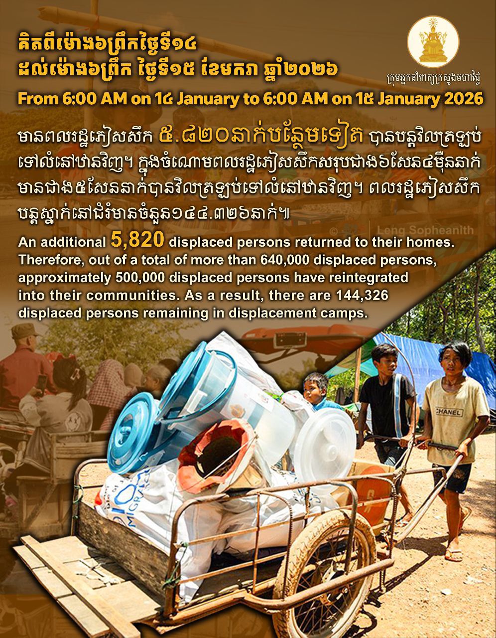 ជាក់ស្តែង ក្រសួងមហាផ្ទៃបានប្រកាសនាល្ងាចថ្ងៃទី១៥ ខែមករា ឆ្នាំ២០២៦នេះថា ៖ មានពលរដ្ឋភៀសសឹក៥.៨២០នាក់បន្ថែមទៀត បានបន្តវិលត្រឡប់ទៅលំនៅឋានវិញ ។