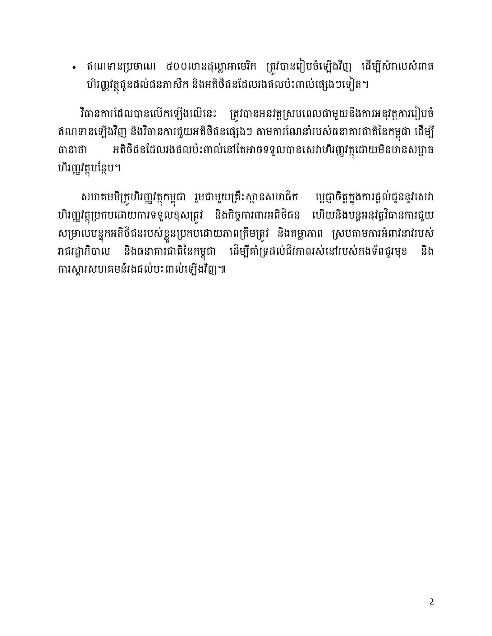 -ឥណទានប្រមាណ៥០០លានដុល្លាអាមេរិក ត្រូវបានរៀបចំឡើងវិញ ដើម្បីសំរាលសំពាធហិរញ្ញ វត្ថុជូនដល់ជនភាសសឹក និងអតិថិជនដែលរងផលប៉ះពាល់ផ្សេងៗទៀត ។