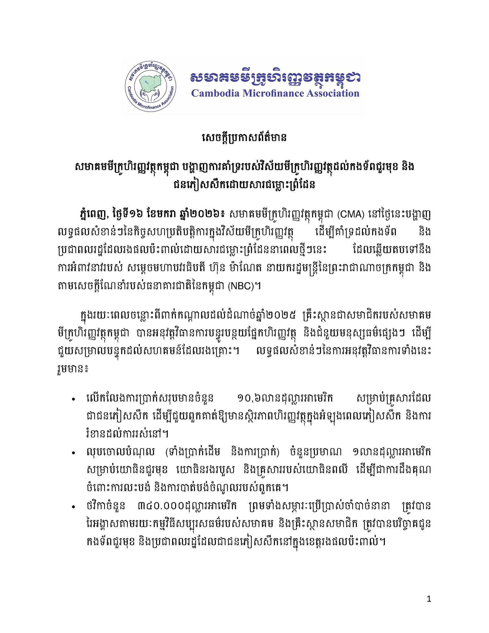 រាជធានីភ្នំពេញ ៖ សមាគមមីក្រូហិរញ្ញវត្ថុកម្ពុជា (CMA) បានបង្ហាញលទ្ធផលសំខាន់ៗនៃកិច្ចសហប្រតិបត្តិការក្នុងវិស័យមីក្រូហិរញ្ញវត្ថុ ដើម្បីគាំទ្រដល់កងទ័ព និងប្រជាពលរដ្ឋដែលរងផលប៉ះពាល់ដោយសារជម្លោះព្រំដែននាពេលថ្មីៗនេះ ដែលឆ្លើយតបទៅនឹងការអំពាវនាវរបស់សម្តេចមហាបវរធិបតី ហ៊ុន ម៉ាណែត នាយករដ្ឋមន្ត្រីនៃព្រះរាជាណាចក្រកម្ពុជា និងតាមសេចក្តីណែនាំរបស់ធនាគារជាតិនៃកម្ពុជា (NBC) ។