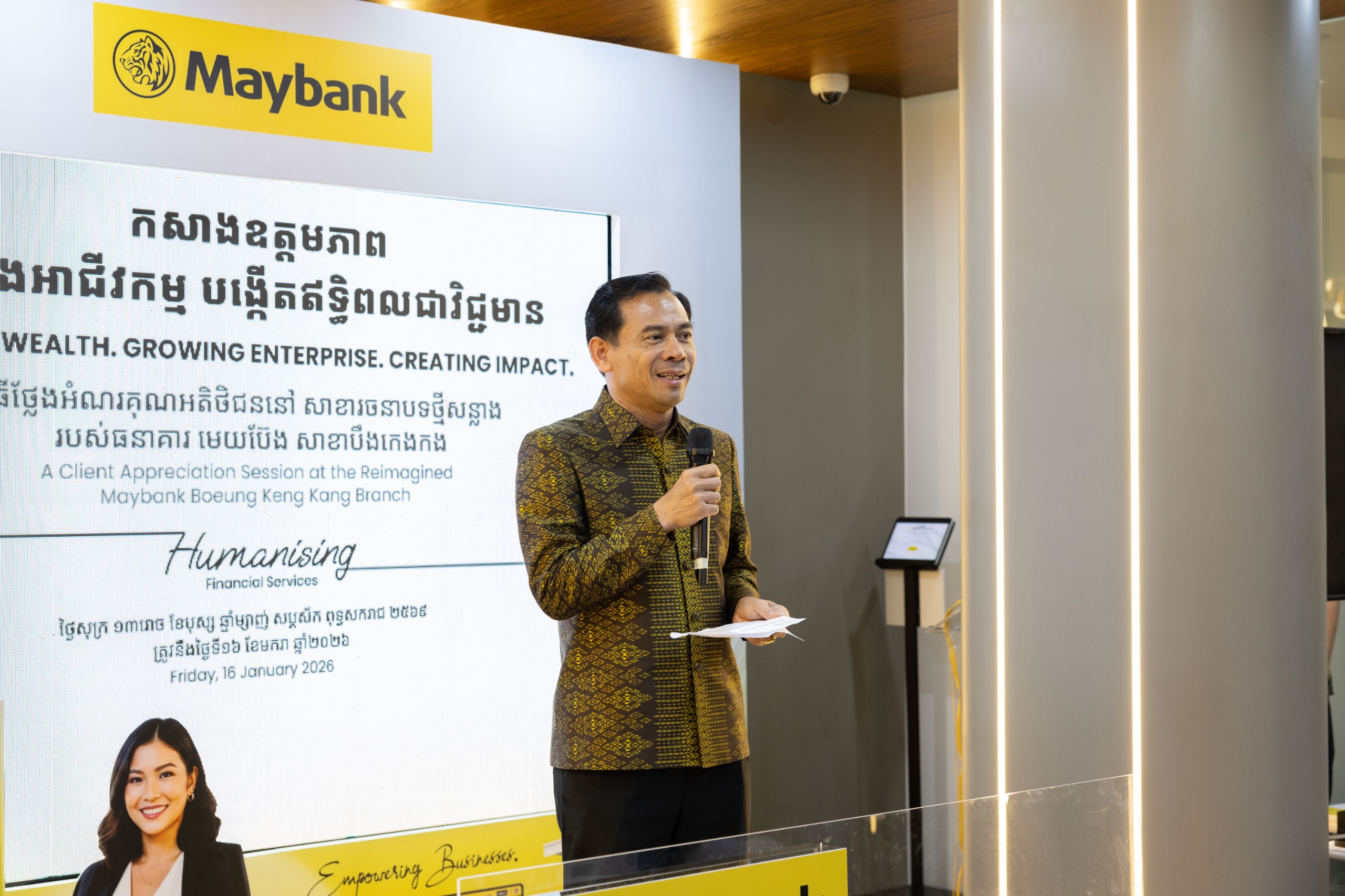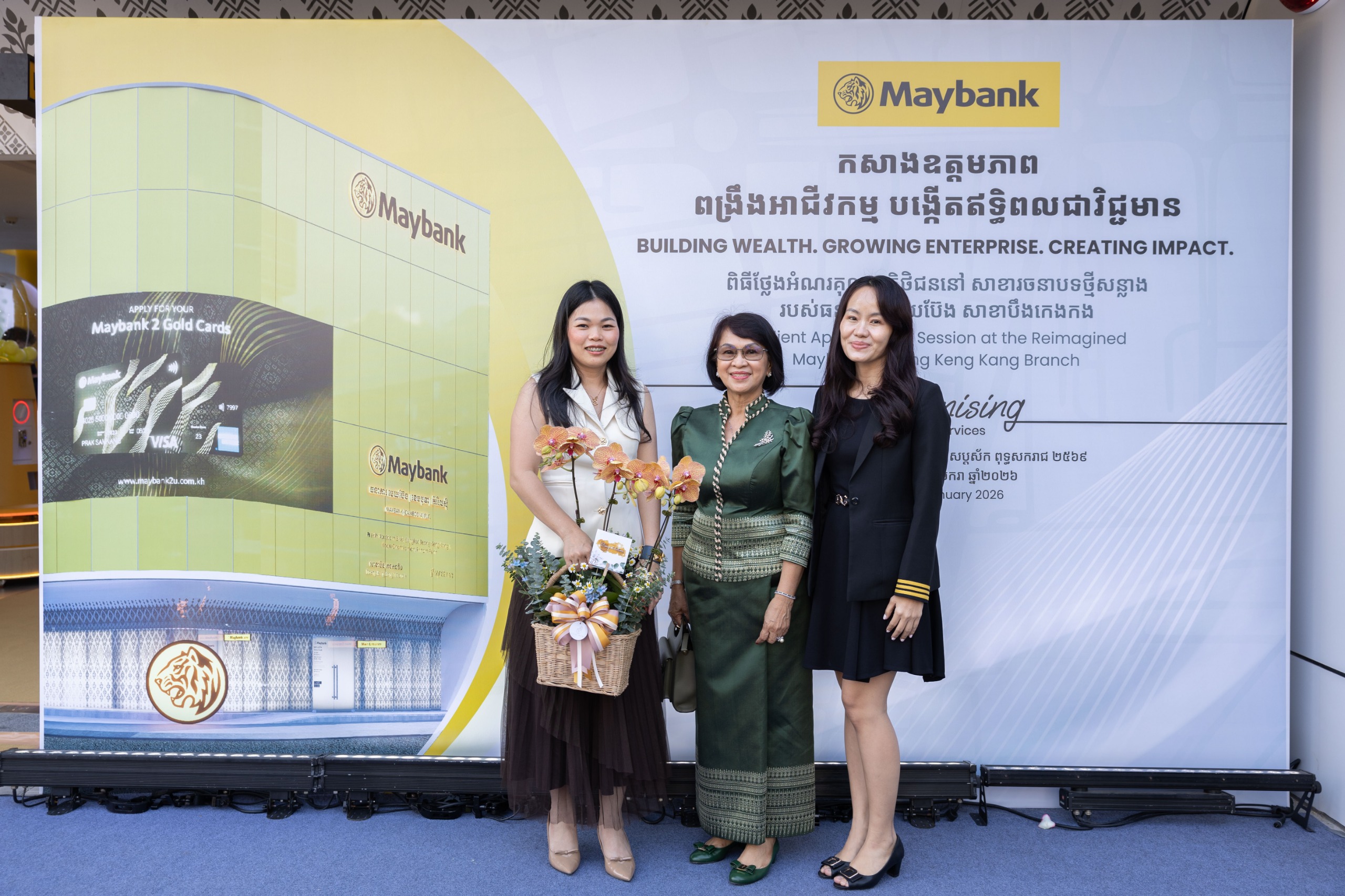 រាជធានីភ្នំពេញ, ថ្ងៃទី ១៦ ខែមករា ឆ្នាំ ២០២៦ ៖ ធនាគារ មេយប៊ែង បានដាក់សម្ពោធជាផ្លូវការសាខាបឹងកេងកងថ្មី និងបានធ្វើការណែនាំនូវបទពិសោធន៍ធនាគារមួយ ដែលលើសពីប្រតិបត្តិការហិរញ្ញវត្ថុធម្មតា តាមរយៈការដាក់ឲ្យដំណើរការសាកល្បងនូវកម្មវិធី Maybank myimpact ដែលជាការផ្តួចផ្តើមរួមបញ្ចូលនូវគុណតម្លៃ នៃចីរភាព ការលើកកម្ពស់បរិយាបន្នហិរញ្ញវត្ថុ និងការរីកចម្រើនប្រកបដោយការទទួលខុសត្រូវ សម្រាប់សេវាកម្មហិរញ្ញវត្ថុប្រចាំថ្ងៃ ។