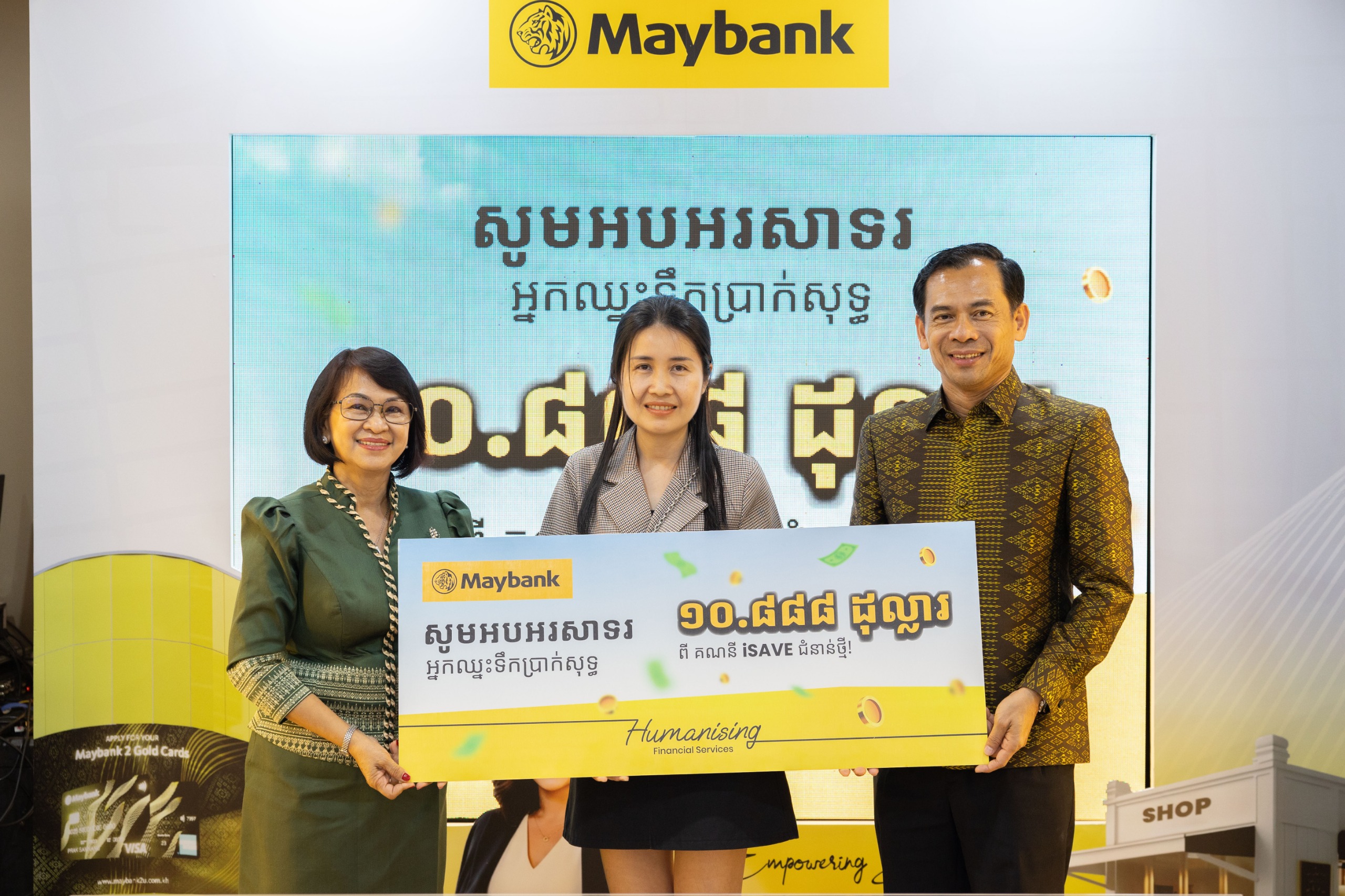 ក្នុងពិធីសម្ពោធនេះដែរ ធនាគារ មេយប៊ែង ក៏បានអបអរសាទរ និងប្រគល់រង្វាន់ធំដល់អ្នកឈ្នះក្នុងកម្មវិធី «iSAVE WIN Big» ដែលការប្រគល់រង្វាន់នេះ បញ្ជាក់ពីការខិតខំប្រឹងប្រែងរបស់អតិថិជនដែលបានដាក់ប្រាក់សន្សំ និងរៀបចំផែនការហិរញ្ញវត្ថុរយៈពេលវែងជាមួយធនាគារ មេយប៊ែង ។ លើសពីនេះ អតិថិជនក៏បានចូលរួមធ្វើជាសាក្សីភាព ក្នុងការចាប់ឆ្នោតផ្សងសំណាងសម្រាប់កម្មវិធី «Win Electric Car with Maybank AMEX Card» ដែលកម្មវិធីនេះបានបញ្ជាក់ពីការប្តេជ្ញាចិត្តរបស់ ធនាគារ មេយប៊ែង ចំពោះការលើកទឹកចិត្តលើការជ្រើសរើស លើការចំណាយមួយដោយមានការទទួលខុសត្រូវសម្រាប់បរិស្ថាន និងឲ្យសមស្របទៅតាមរបៀបរស់នៅប្រកបដោយចីរភាព ។