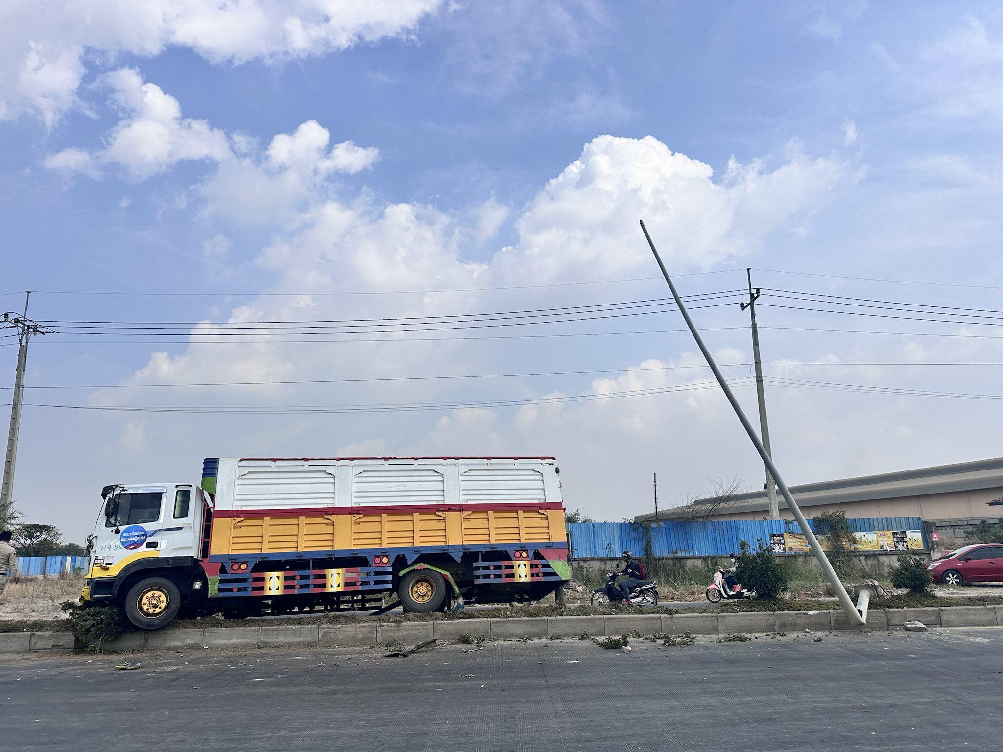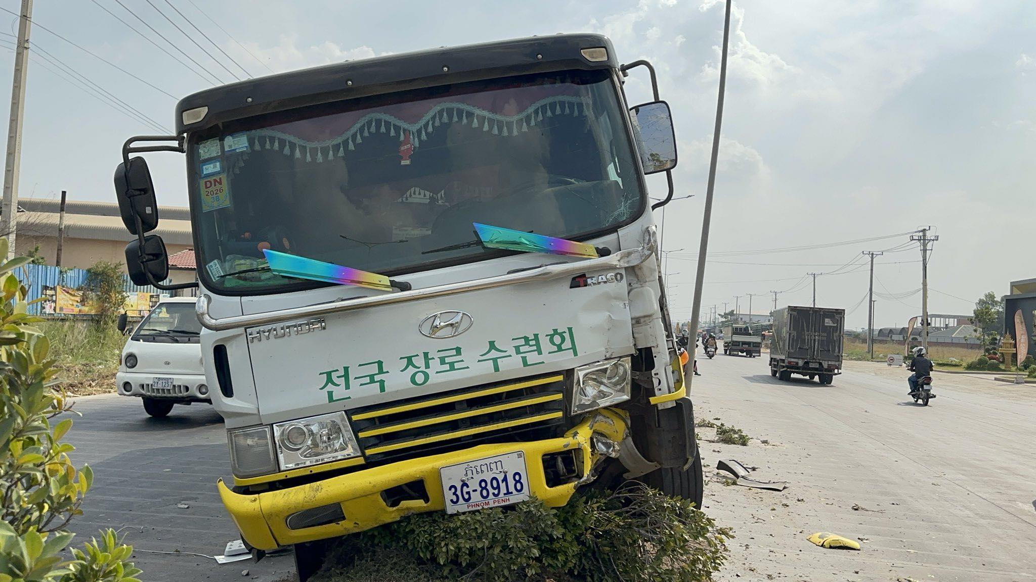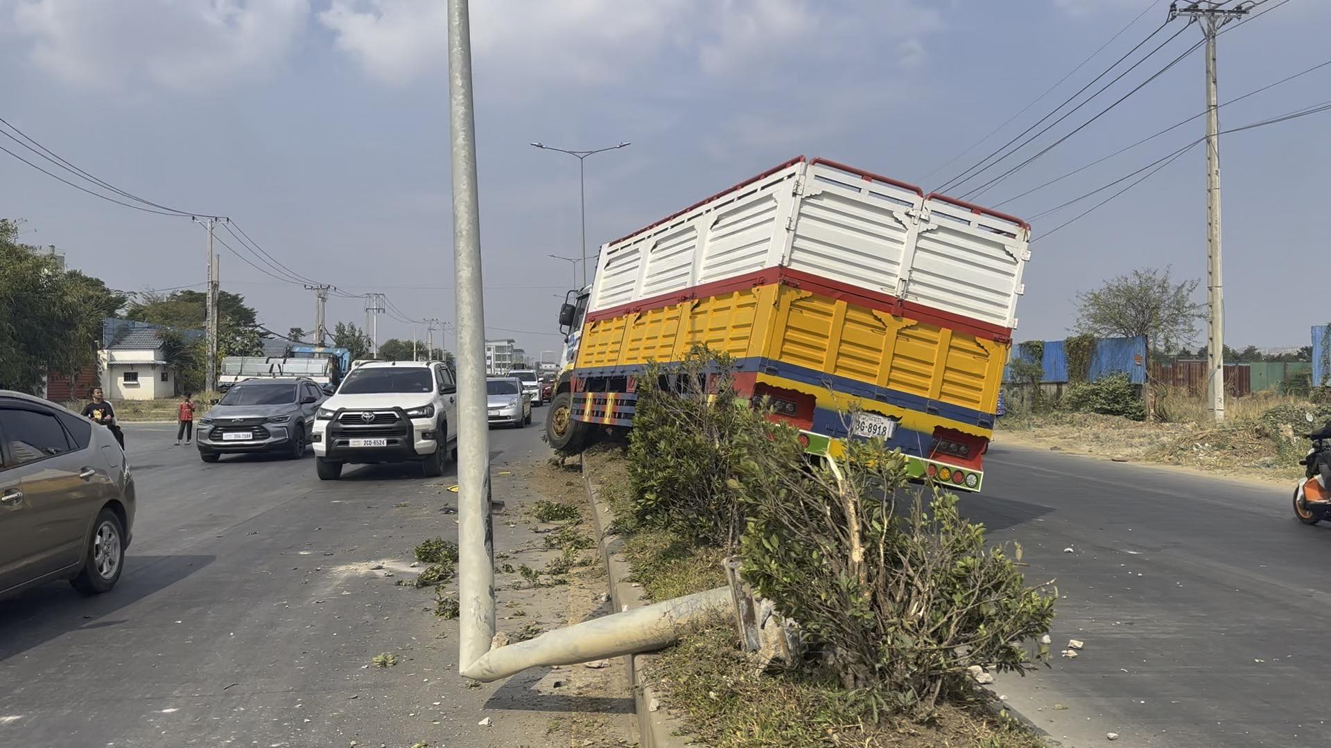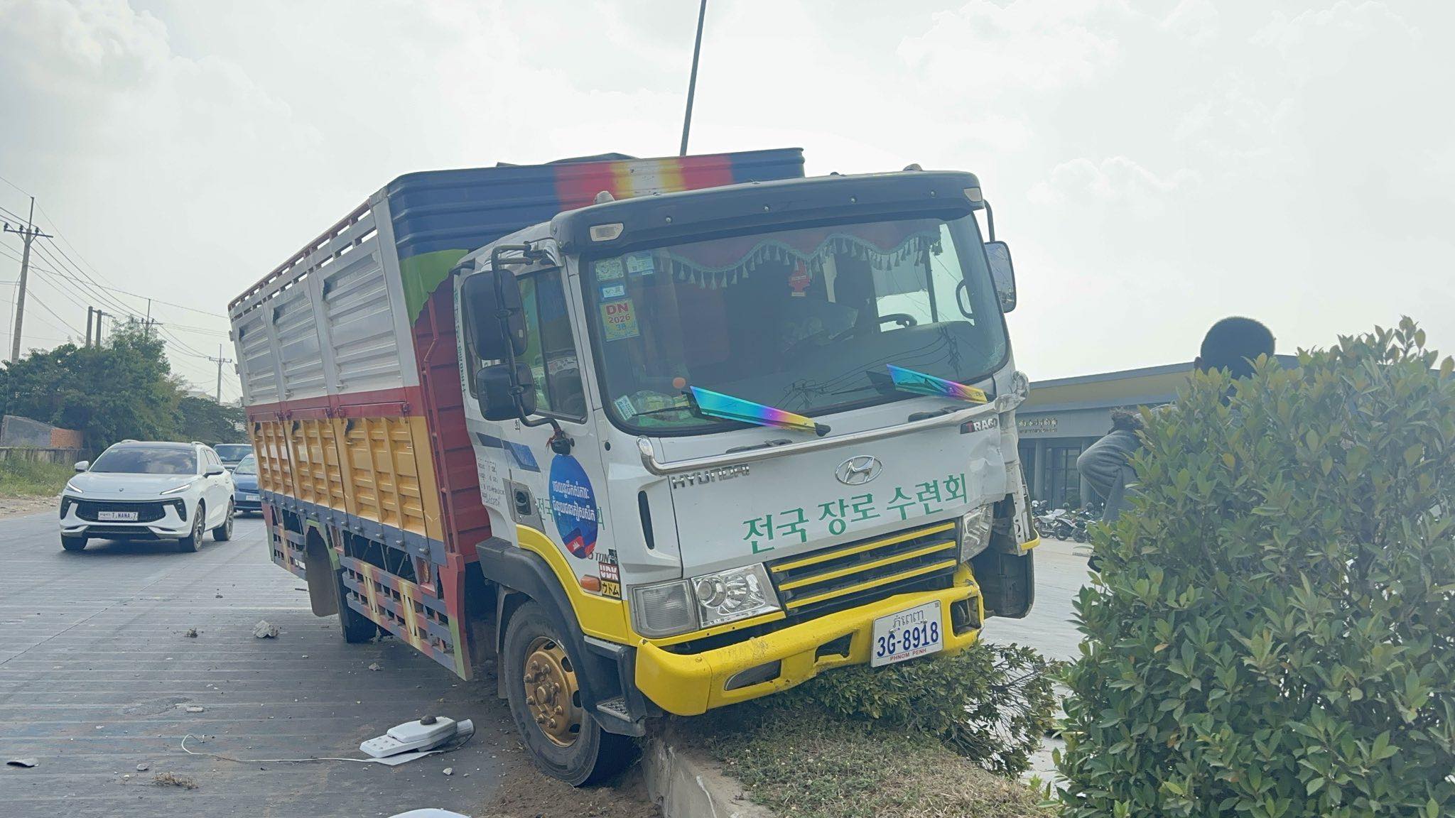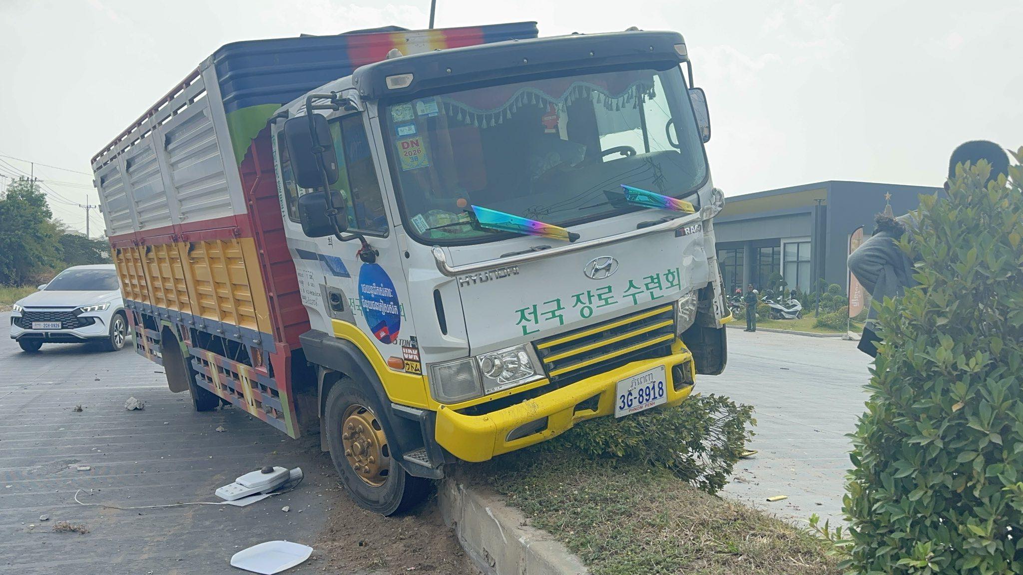 រាជធានីភ្នំពេញ ៖ រថយន្តម៉ាកហ៊ីយ៉ាន់ដាយ ដឹកទំនិញ ១គ្រឿង បានរេចង្កូតបុកឡើងលើសួនច្បារពុះចែកទ្រូងផ្លូវទាំងកំរោល បណ្ដាលឲ្យខូចខាត និងបាក់បង្គោលភ្លើងបំភ្លឺផ្លូវ១ដើម ព្រមទាំងរលើងដើមផ្កាអស់ជាច្រើនគុម្ព ថែមទៀតផង បន្ទាប់មកអ្នកបើកបរបានរត់គេចខ្លួនបាត់ស្រមោល ។