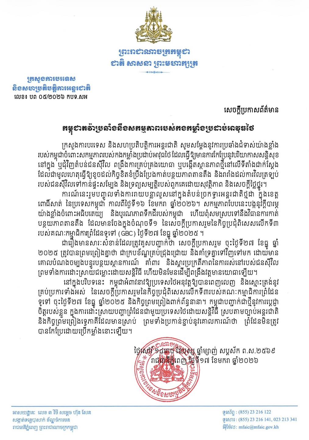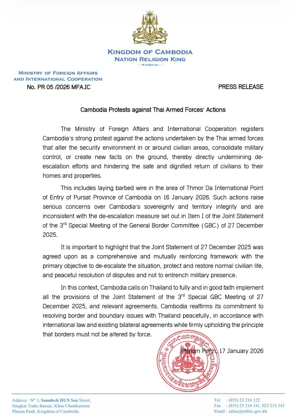 រាជធានីភ្នំពេញ ៖ ក្រសួងការបរទេស និងសហប្រតិបត្តិការអន្តរជាតិ នៅថ្ងៃទី ១៧ ខែមករា ឆ្នាំ ២០២៦ នេះបានចេញសេចក្តីប្រកាសព័ត៌មាន ដោយសម្តែងនូវការប្រឆាំងជំទាស់យ៉ាងខ្លាំង របស់កម្ពុជាចំពោះសកម្មភាពរបស់កងកម្លាំងប្រដាប់អាវុធថៃ ដែលធ្វើឱ្យមានការកែប្រែនូវបរិយាកាសសន្តិសុខ នៅក្នុង ឬជុំវិញតំបន់ជនស៊ីវិល ពង្រឹងការគ្រប់គ្រងយោធា ឬបង្កើតស្ថានភាពថ្មីនៅលើទីតាំងជាក់ស្ដែង ដែលជាមូលហេតុធ្វើឱ្យខូចដល់កិច្ចខិតខំប្រឹងប្រែងកាត់បន្ថយភាពតានតឹង និងរារាំងដល់ការវិលត្រឡប់ របស់ជនស៊ីវិលទៅកាន់ផ្ទះសម្បែង និងទ្រព្យសម្បត្តិរបស់ពួកគេដោយសុវត្ថិភាព និងសេចក្តីថ្លៃថ្នូរ ។ ការណ៍នេះរួមបញ្ចូលទាំងការរាយបន្លាលួសនៅក្នុងតំបន់ច្រកទ្វារអន្តរជាតិថ្មដា ក្នុងខេត្តពោធិ៍សាត់ នៃប្រទេសកម្ពុជា កាលពីថ្ងៃទី ១៦ ខែមករា ឆ្នាំ ២០២៦ ។ សកម្មភាពបែបនេះបង្កនូវក្តីបារម្ភ យ៉ាងខ្លាំងចំពោះអធិបតេយ្យ និងបូរណភាពទឹកដីរបស់កម្ពុជា ហើយពុំសមស្របទៅនឹងវិធានការកាត់បន្ថយភាពតានតឹង ដែលមានចែងក្នុងចំណុចទី ១ នៃសេចក្តីប្រកាសរួមនៃកិច្ចប្រជុំពិសេសលើកទី ៣ របស់គណៈកម្មាធិការព្រំដែនទូទៅ (GBC) ថ្ងៃទី ២៧ ខែធ្នូ ឆ្នាំ ២០២៥ ។