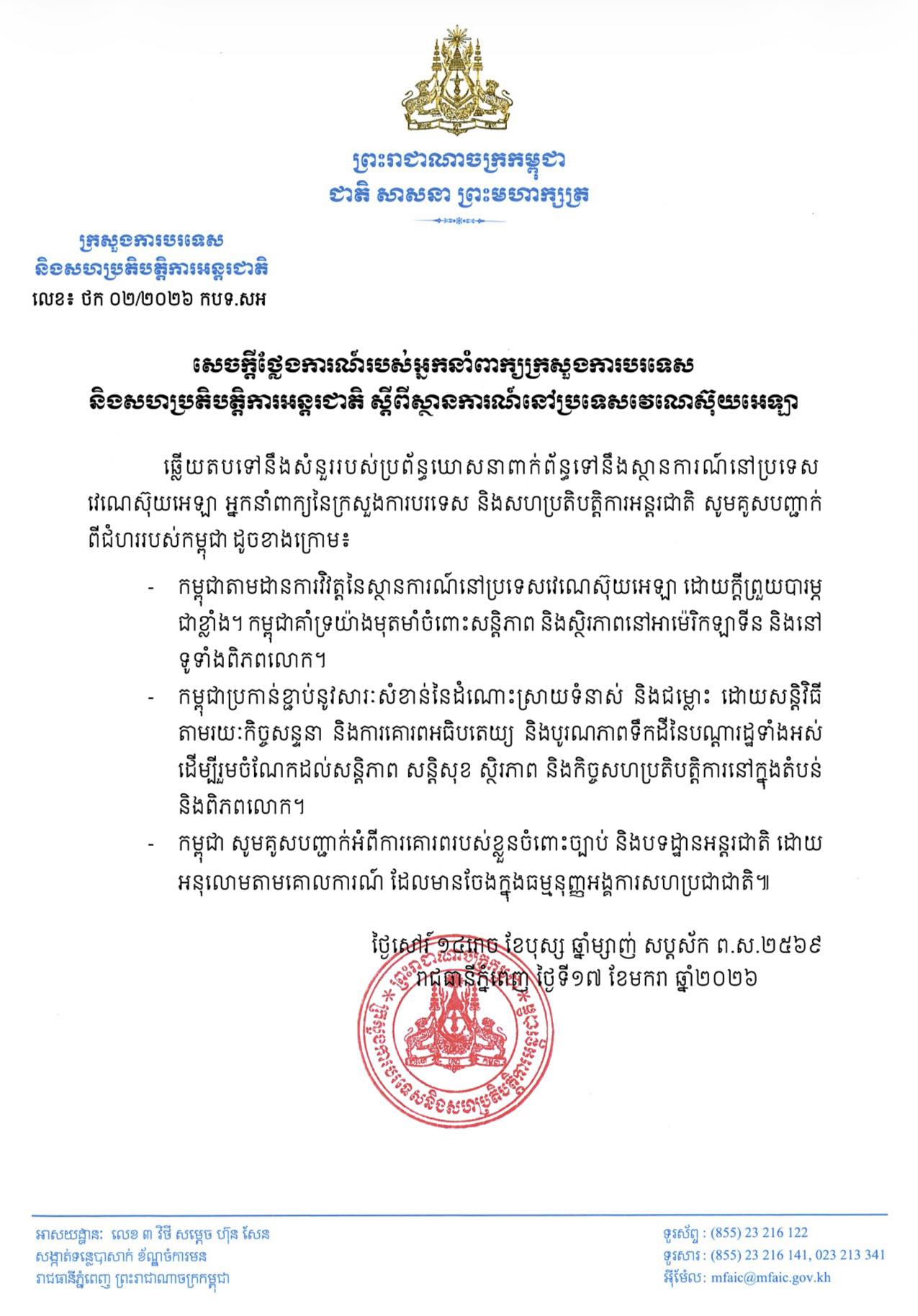 រាជធានីភ្នំពេញ ៖ កម្ពុជាបានសម្តែងការព្រួយបារម្ភជាខ្លាំងចំពោះស្ថានការណ៍នៅប្រទេសវេណេស៊ុយអេឡា ។ នៅថ្ងៃទី ១៧ ខែមករា ឆ្នាំ ២០២៦ នេះ អ្នកនាំពាក្យក្រសួងការបរទស និងសហប្រតិបត្តិការអន្តរជាតិ បានចេញសេចក្តីថ្លែងការណ៍ ស្ដីពីស្ថានការណ៍នៅប្រទេសវណេស៊ុយអេឡា ។