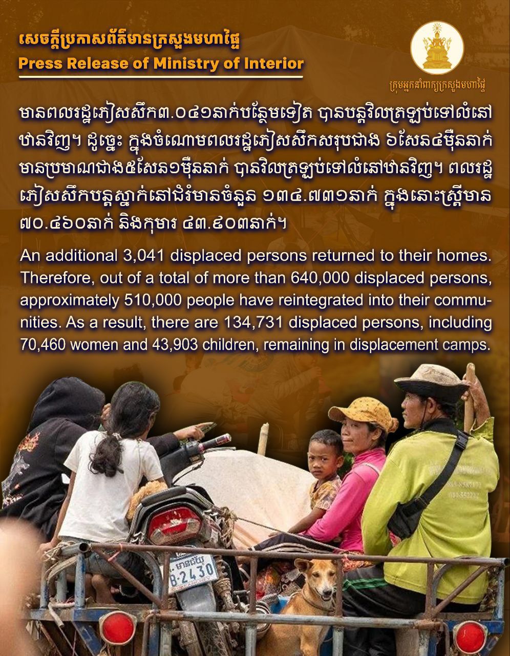 ក្រសួងមហាផ្ទៃបានប្រកាសថា ក្នុងរយៈពេល ២៤ ម៉ោងកន្លងមកនេះ មានបងប្អូនប្រជាពលរដ្ឋភៀសសឹកចំនួន ៣.០៤១ នាក់បន្ថែមទៀត បានសម្រេចចិត្តចាកចេញពីជំរំស្នាក់នៅបណ្ដោះអាសន្ន ដើម្បីវិលត្រឡប់ទៅកាន់លំនៅឋាន និងស្រុកកំណើតរបស់ពួកគេវិញ ។