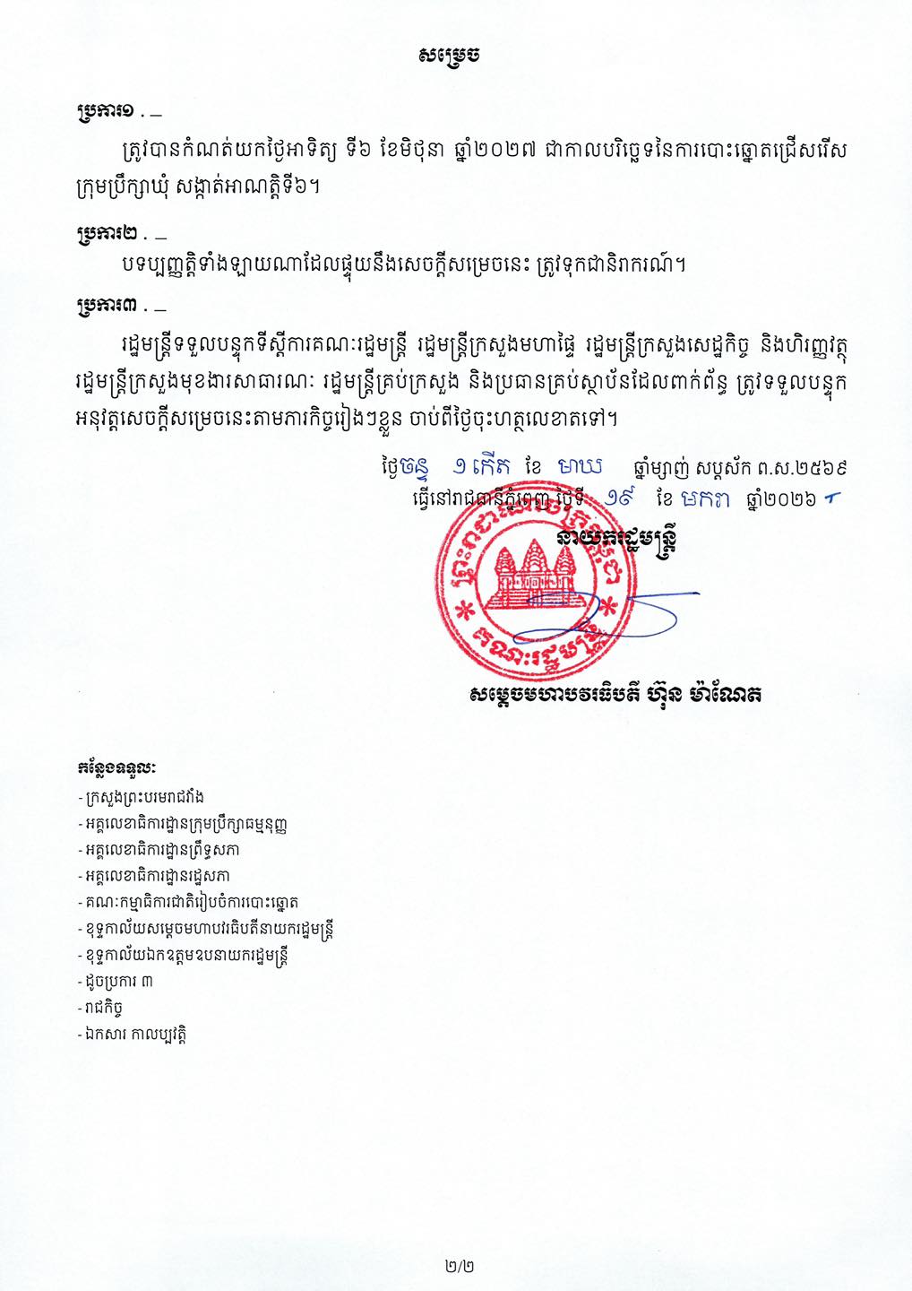 រាជរដ្ឋាភិបាល កំណត់ថ្ងៃទី៦ ខែមិថុនា ឆ្នាំ២០២៧ បោះឆ្នោតជ្រើសរើសក្រុមប្រឹក្សាឃុំ សង្កាត់អាណត្តិទី៦