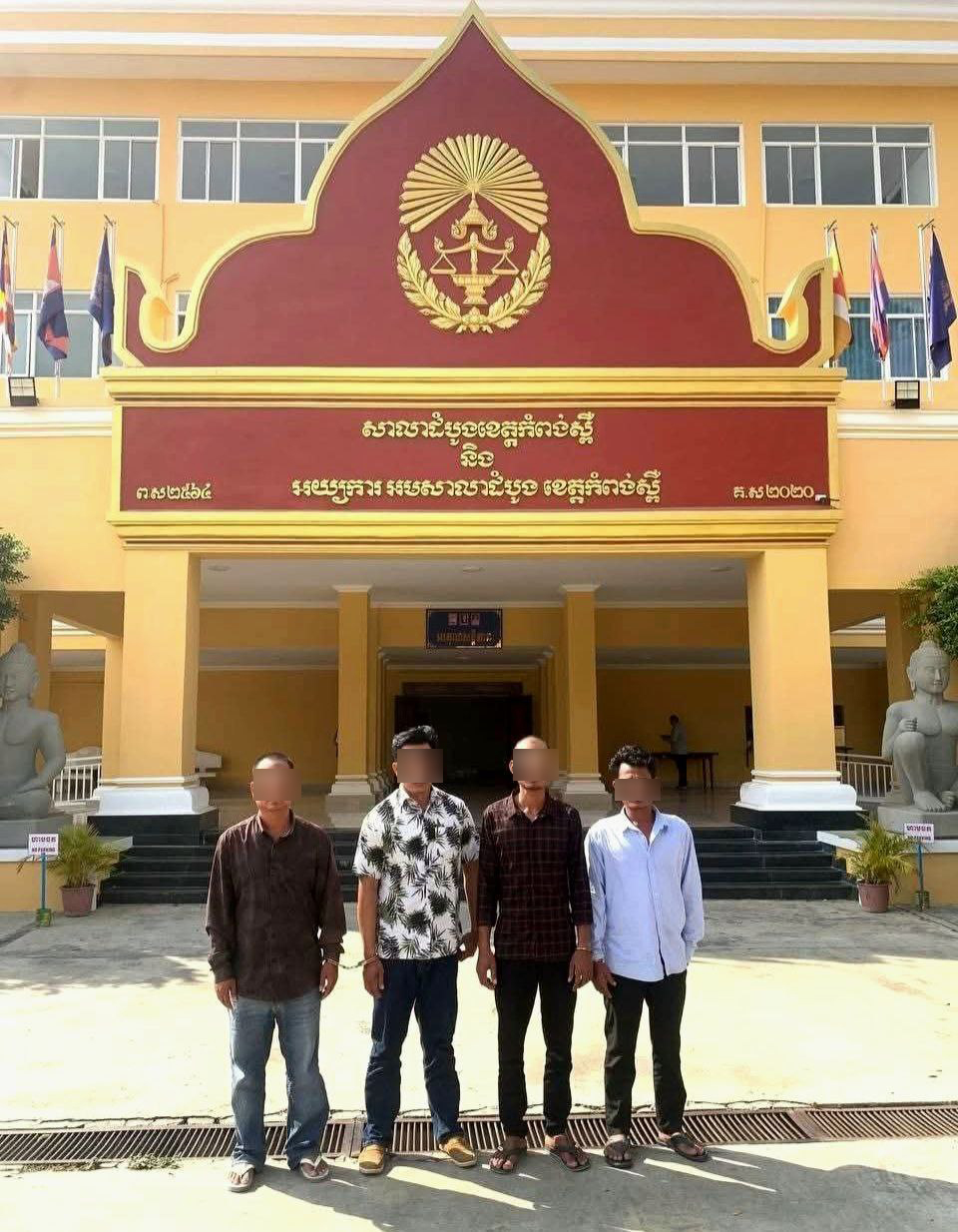 បច្ចុប្បន្នក្រុមជនសង្ស័យទាំង៤នាក់ខាងលើ រួមជាមួយនឹងវត្ថុតាងត្រូវបានកម្លាំងជំនាញ កងរាជអាវុធហត្ថខេត្តកំពង់ស្ពឺ កសាងសំណុំរឿងបញ្ជូនទៅសាលាដំបូងខេត្តកំពង់ស្ពឺ ដើម្បីចាត់ការបន្តតាមផ្លូវច្បាប់ ។ ប៉ុណ្ណឹងហើយ…ថ្ងៃក្រោយទៀតបើមិនរាងទេ !…សុំកុំរាង !!…ហេ! ហេ! ៕