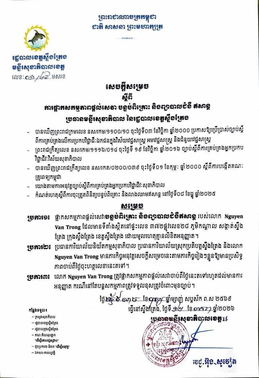 ខេត្តស្ទឹងត្រែង ៖ កម្លាំងចម្រុះ នៃរដ្ឋបាលក្រុងស្ទឹងត្រែង សហការជាមួយមន្ទីរសុខាភិបាលខេត្ត បានចុះអនុវត្តវិធានការរដ្ឋបាល បិទផ្អាកសកម្មភាពផ្តល់សេវាសុខាភិបាល ជាបណ្តោះអាសន្ន នៅបន្ទប់ពិគ្រោះ និងព្យាបាលជំងឺ “ឥសាន្ត” កាលពីព្រឹកថ្ងៃចន្ទ ទី១៩ ខែមករា ឆ្នាំ២០២៦ ។
