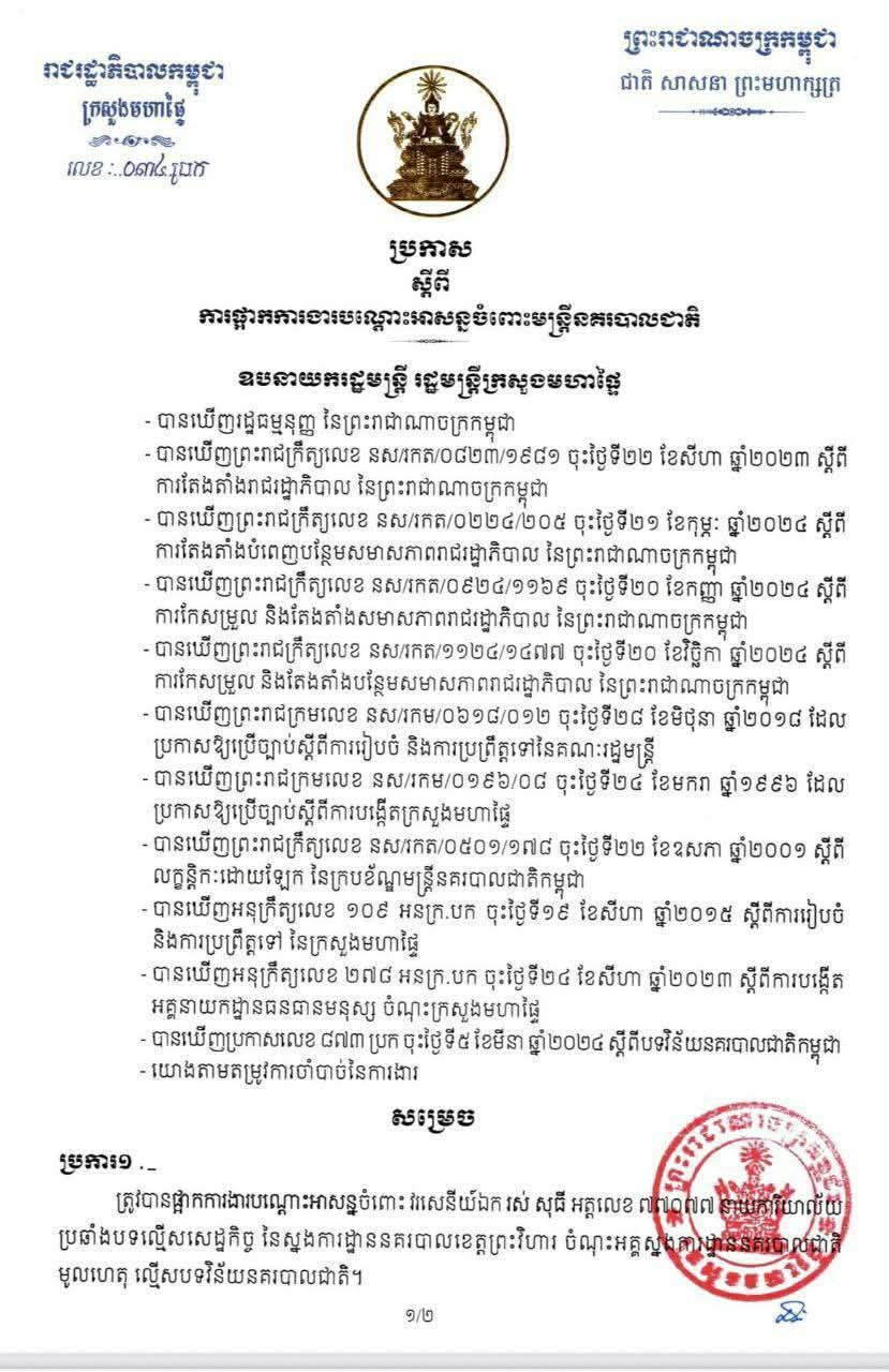 ខេត្តព្រះវិហារ ៖ ឯកឧត្តមអភិសន្តិបណ្ឌិត ស សុខា ឧបនាយករដ្ឋមន្ត្រី រដ្ឋមន្ត្រីក្រសួងមហាផ្ទៃ បានសម្រេចចេញប្រកាសផ្អាកការងារបណ្តោះអាសន្នចំពោះមន្ត្រីនគរបាលជាតិម្នាក់ នៅស្នងការដ្ឋាននគរបាលខេត្តព្រះវិហារ ក្រោមមូលហេតុល្មើសបទវិន័យរបស់នគរបាលជាតិ ។