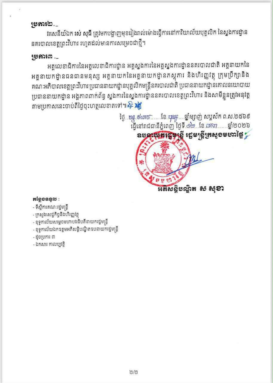 ប្រការ២-ក្នុងអំឡុងពេលនៃការផ្អាកការងារនេះ លោកវរសេនីយ៍ឯក រស់ សុធី ត្រូវបានតម្រូវឱ្យមកបង្ហាញមុខនៅការិយាល័យបុគ្គលិកនៃស្នងការដ្ឋាននគរបាលខេត្តព្រះវិហាររៀងរាល់ម៉ោងធ្វើការ ដើម្បីរង់ចាំការសម្រេចជាថ្មីពីថ្នាក់ដឹកនាំ។