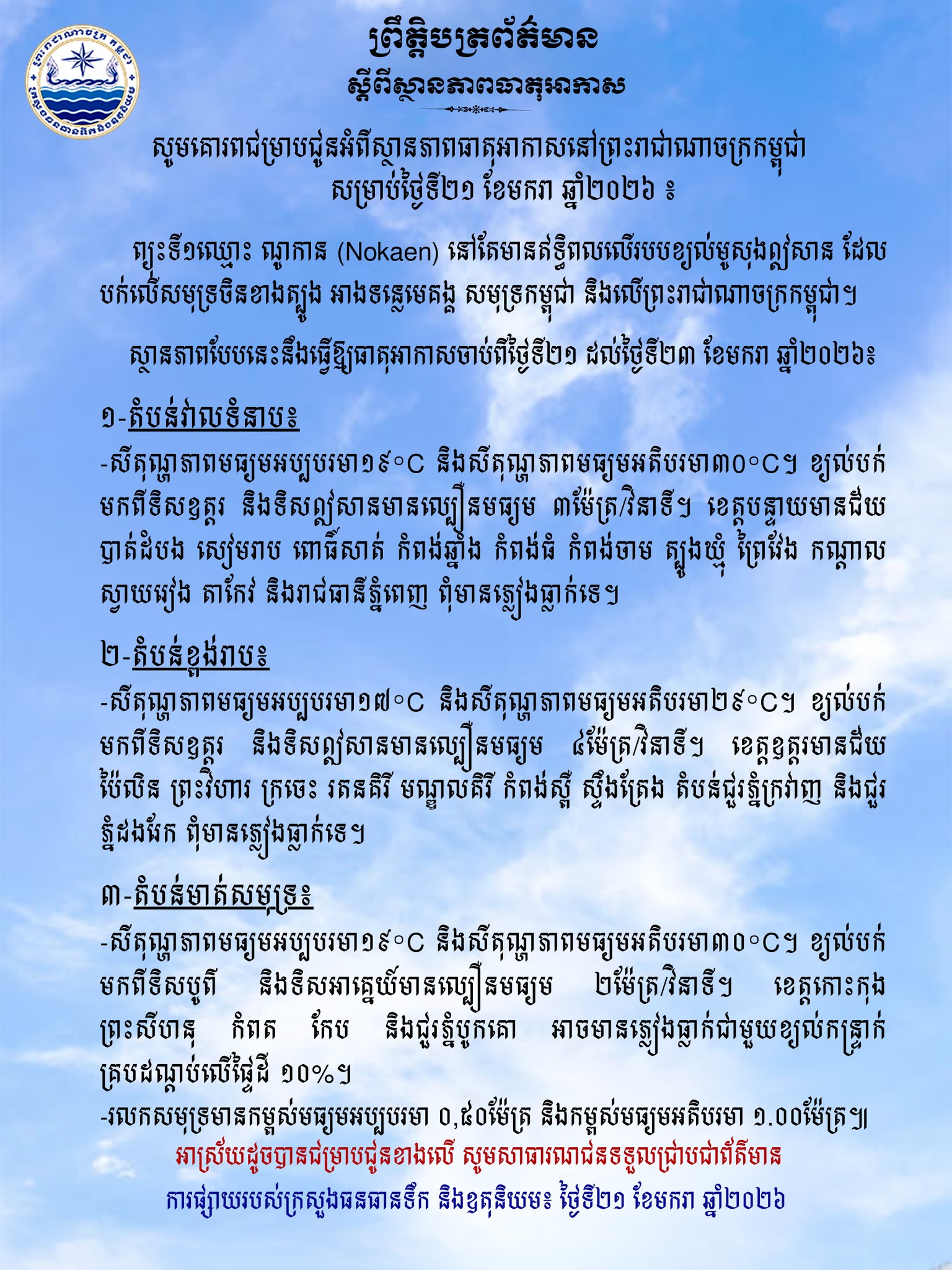យោងតាមព្រឹត្តិបត្រព័ត៌មាន ស្តីពីស្ថានភាពធាតុអាកាសរបស់ក្រសួងធនធានទឹក បានលើកឡើងអំពីស្ថានភាពធាតុអាកាសនៅព្រះរាជាណាចក្រកម្ពុជា សម្រាប់ថ្ងៃទី២១ ខែមករា ឆ្នាំ២០២៦ ថា ព្យុះទី១ឈ្មោះ ណូកាន (Nokaen) នៅតែមានឥទ្ធិពលលើរបបខ្យល់មូសុងឦសាន ដែល បក់លើសមុទ្រចិនខាងត្បូង អាងទន្លេមេគង្គ សមុទ្រកម្ពុជា និងលើព្រះរាជាណាចក្រកម្ពុជា ។
