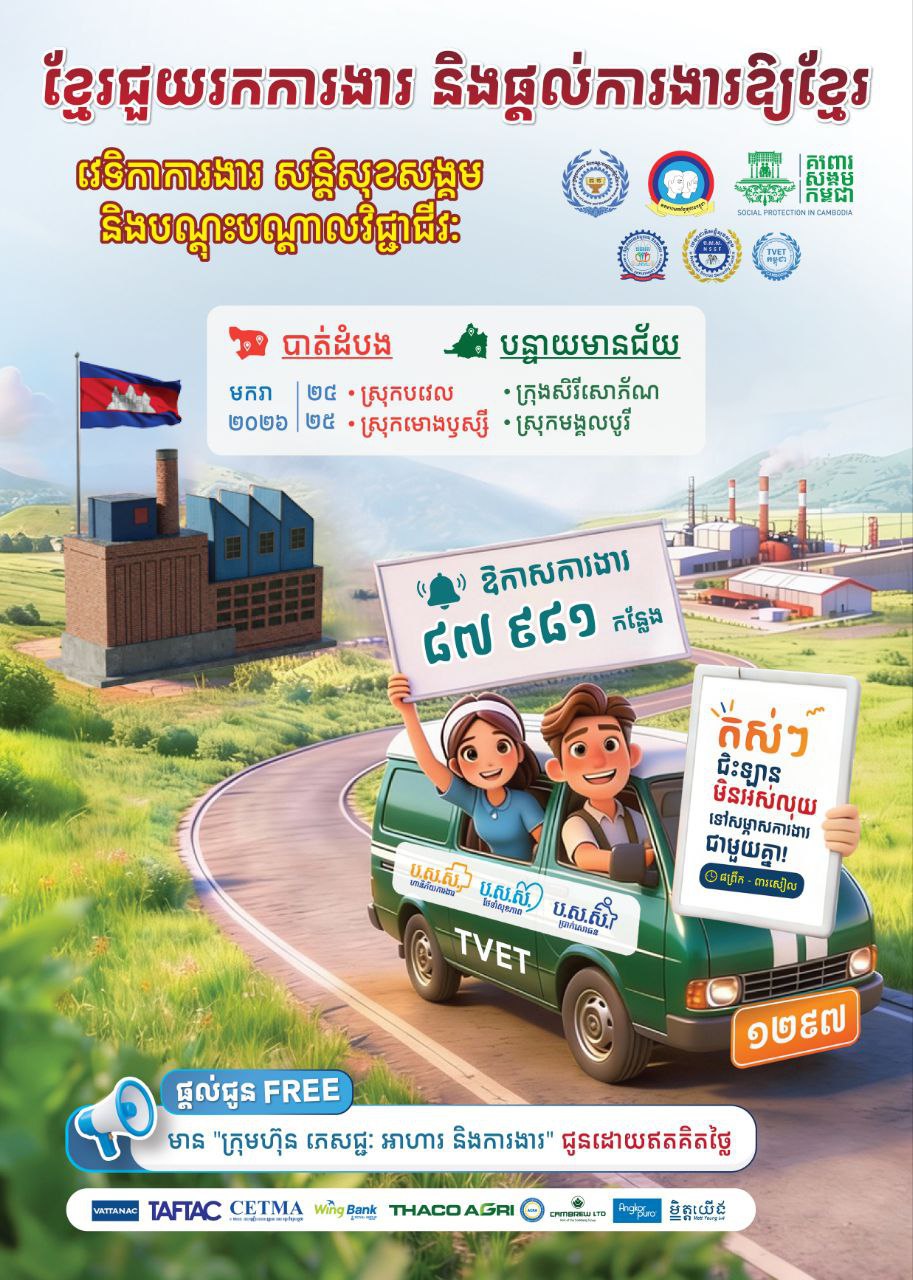 រាជធានីភ្នំពេញ ៖ អ្នកនាំពាក្យក្រសួងការងារ និងបណ្តុះបណ្តាលវិជ្ជាជីវៈ លោក ស៊ុន មេសា នៅថ្ងៃទី ២២ ខែមករា ដើមឆ្នាំ ២០២៦នេះ បានក្រើនរំលឹកដល់បងប្អូនអតីតពលករនៅខេត្តបាត់ដំបង និងខេត្តបន្ទាយមានជ័យ កុំភ្លេចចូលរួមក្នុងវេទិកាការងារក្រោមប្រធានបទ “ខ្មែរជួយរកការងារ និងផ្ដល់ការងារឱ្យខ្មែរ” ដែលនឹងប្រព្រឹត្តទៅនៅ៤ទីតាំងផ្សេងគ្នាក្នុងខេត្តបាត់ដំបង និងខេត្តបន្ទាយមានជ័យ នាថ្ងៃទី ២៤-២៥ ខែមករានេះ ដែលមានឱកាសការងារជិត ៩ម៉ឺនកន្លែងសម្រាប់បងប្អូនដាក់ពាក្យ និងសម្ភាសភ្លាមៗនៅទីតាំងផ្ទាល់ ។