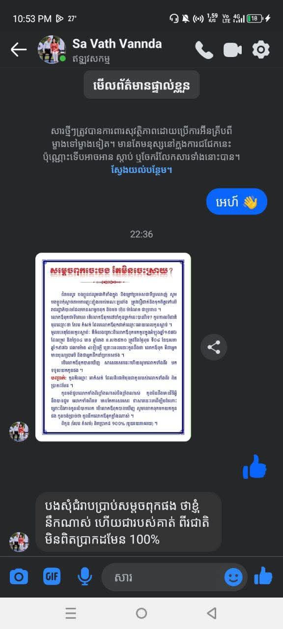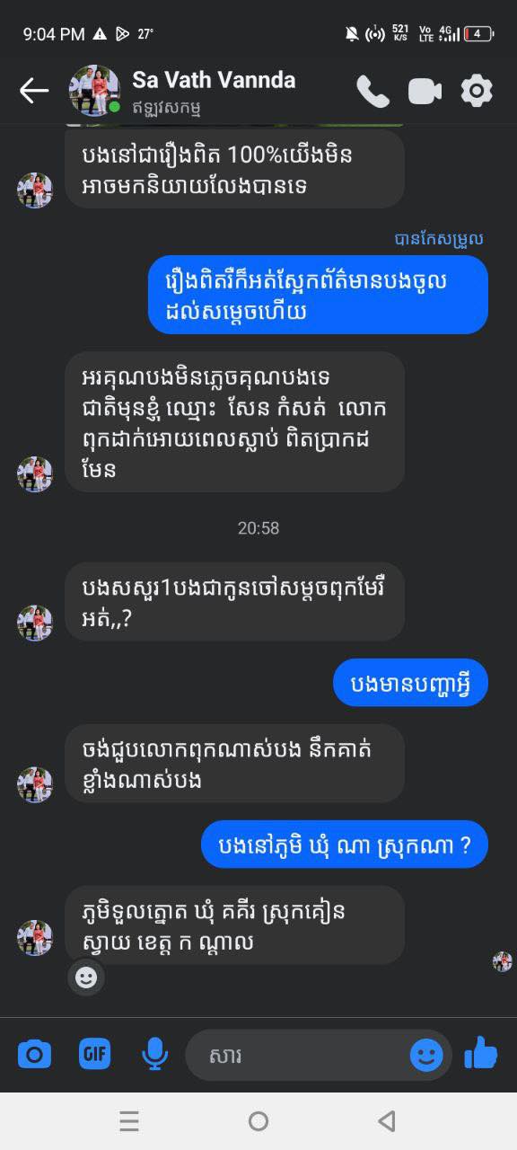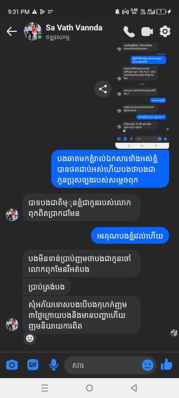 សម្ដេចតេជោបានបន្ថែមថា ៖ «ករណីចុងក្រោយហាក់ដូចធ្ងន់បន្តិចមានទាំងអត្ថបទមានទាំងសារឆ្លើយឆ្លងជាមួយមនុស្សដែលស្គាល់ telegram របស់ខ្ញុំ ។ ខ្ញុំសូមអំពាវនាវដល់អ្នកភូតកុហកឈប់ប្រើការឈឺចាប់របស់ខ្ញុំដើម្បីផលប្រយោជន៍ផ្ទាល់ខ្លួនតទៅទៀតទៅ» ៕