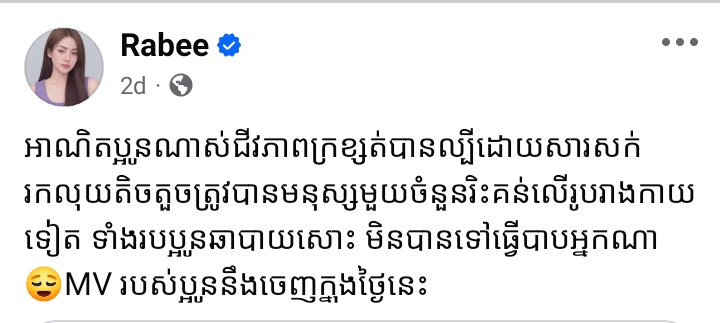 តាមរយៈសំណេរបង្ហោះលើបណ្តាញសង្គម តារាចម្រៀងអ្នកនាង រ៉ាប៊ី បានលើកឡើងថា អាណិតប្អូនណាស់ ជីវភាពក្រខ្សត់ បានល្បីដោយសារសក់ រកលុយតិចតួចត្រូវបានមនុស្សមួយចំនួនរិះគន់លើរូបរាងកាយទៀត ទាំងរបរប្អូនឆាបាយសោះ មិនបានទៅធ្វើបាបអ្នកណា ។