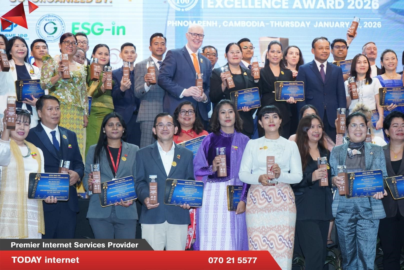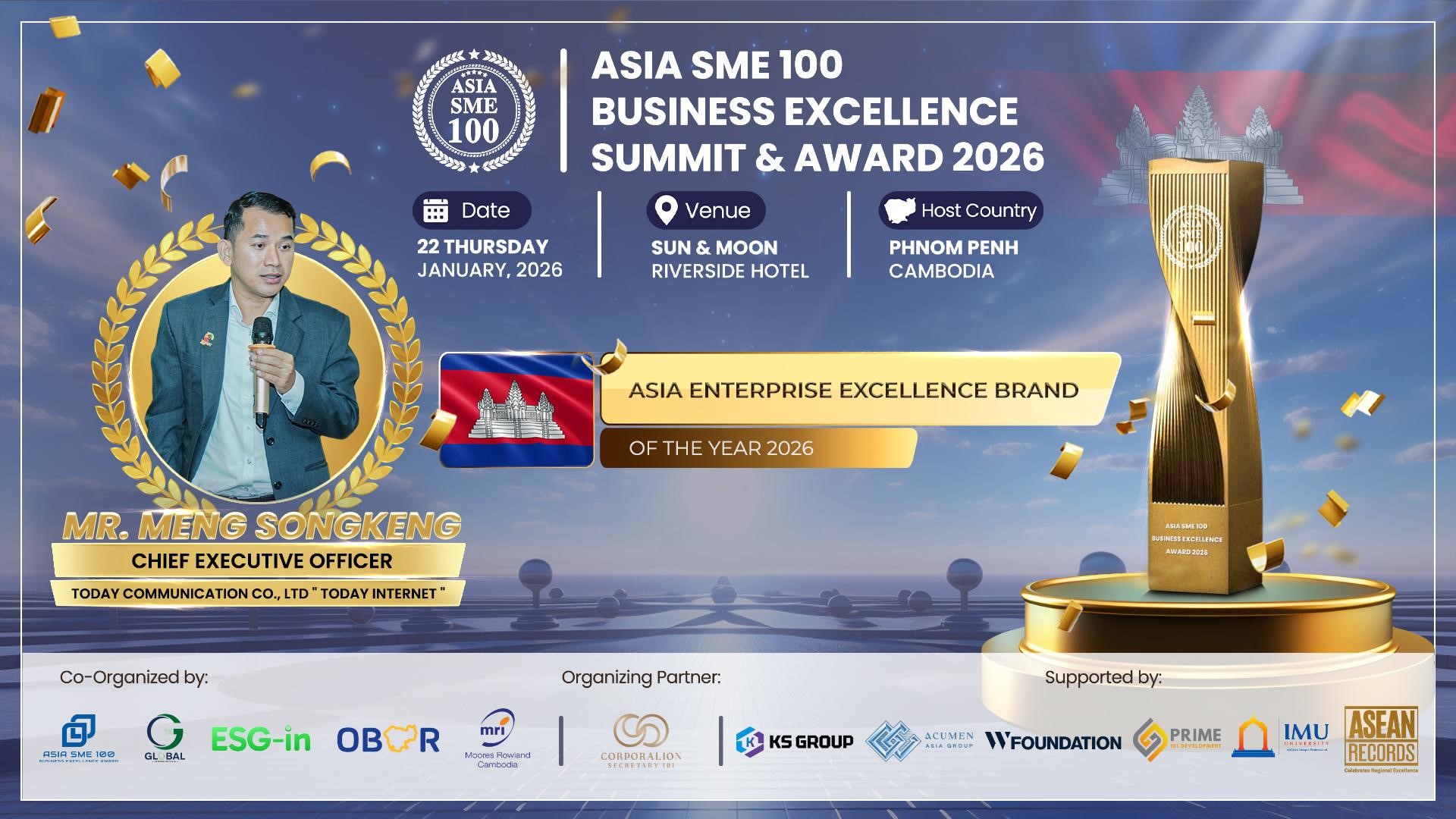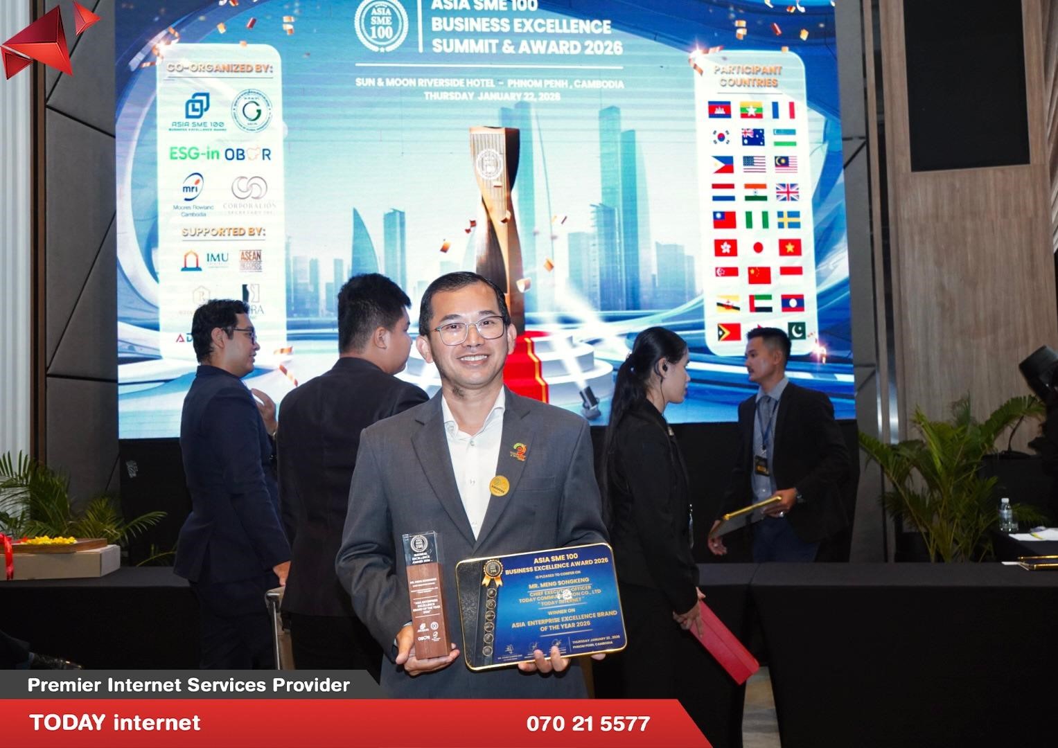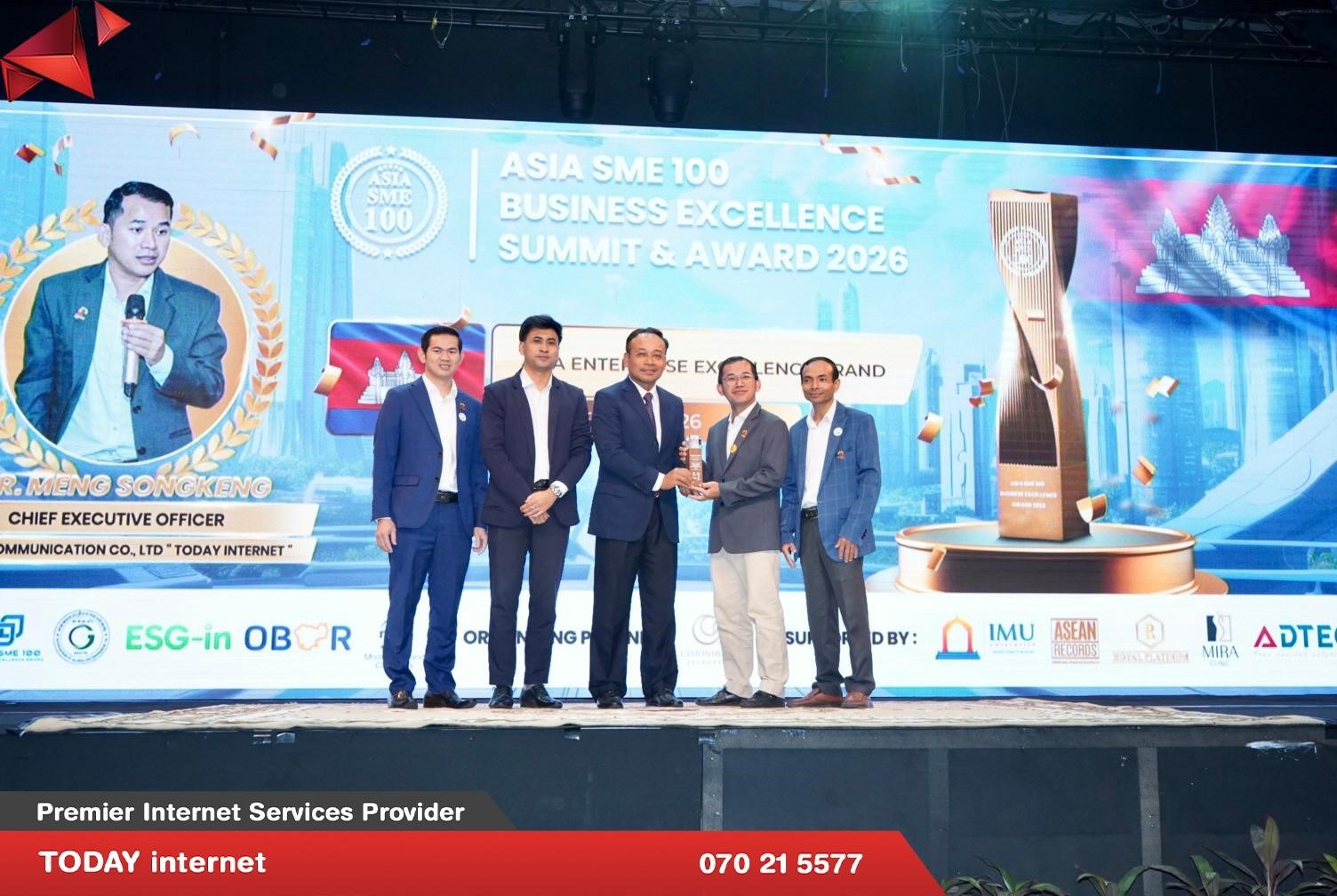 រាជធានីភ្នំពេញ៖ ក្រុមហ៊ុន TODAY internet គឺជាក្រុមហ៊ុនផ្ដល់សេវាអុីនធឺណិតកម្រិតខ្ពស់ ដែលបង្កើតឡើង ដោយស្នាដៃកូនខ្មែរចាប់តាំងពីឆ្នាំ ២០១៦ មកម្ល៉េះ ។ កាលពីពេលថ្មីៗនេះលោក ម៉េង សុងកេង ដែលជានាយកប្រតិបត្តិនៃក្រុមហ៊ុន TODAY internet បានទទួលពានរង្វាន់ “ASIA SME 100 BUSINESS EXCELLENCE SUMMIT & AWARD 2026” On “ASIA ENTERPRISE EXCELLENCE BRAND OF THE YEAR 2026” ។