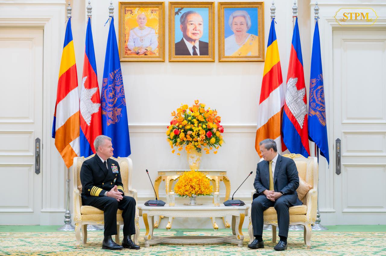 រាជធានីភ្នំពេញ ៖ សម្តេចមហាបវរធិបតី ហ៊ុន ម៉ាណែត នាយករដ្ឋមន្ត្រីនៃកម្ពុជា អនុញ្ញាតឱ្យ ឯកឧត្តមនាយឧត្តមនាវី Samuel Paparo មេបញ្ជាការនៃបញ្ជាការដ្ឋានឥណ្ឌូ-ប៉ាស៊ីហ្វិក នៃសហរដ្ឋអាមេរិក ចូលជួបសម្តែងការគួរសម និងពិភាក្សាការងារ នៅវិមានសន្តិភាពនាព្រឹកថ្ងៃចន្ទ ទី២៦ មករា ២០២៦ ។