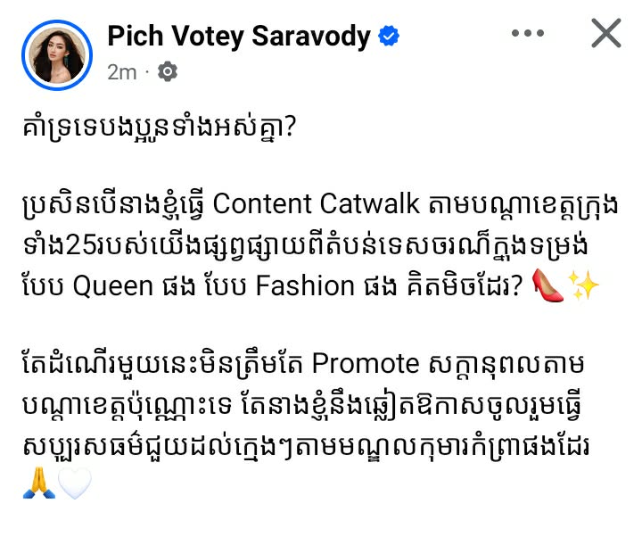 បណ្តាញសង្គមបានឲ្យដឹងថា គាំទ្រទេបងប្អូនទាំងអស់គ្នា? ប្រសិនបើនាងខ្ញុំធ្វើ Content Catwalk តាមបណ្តាខេត្ត-ក្រុងទាំង25របស់យើង ចូលរួមផ្សព្វផ្សាយពីតំបន់ទេសចរណ៍ក្នុងទម្រង់បែប Queen ផង បែប Fashion ផង គិតមិចដែរ? 👠តែដំណើរមួយនេះមិនត្រឹមតែ Promote សក្តានុពលតាមបណ្តាខេត្ត-ក្រុងប៉ុណ្ណោះទេ តែនាងខ្ញុំនឹងឆ្លៀតឱកាសចូលរួមធ្វើសប្បុរសធម៌ជួយដល់សង្គមនិងក្មេងៗតាមមណ្ឌលកុមារកំព្រាផងដែរ 🙏🤍 ។