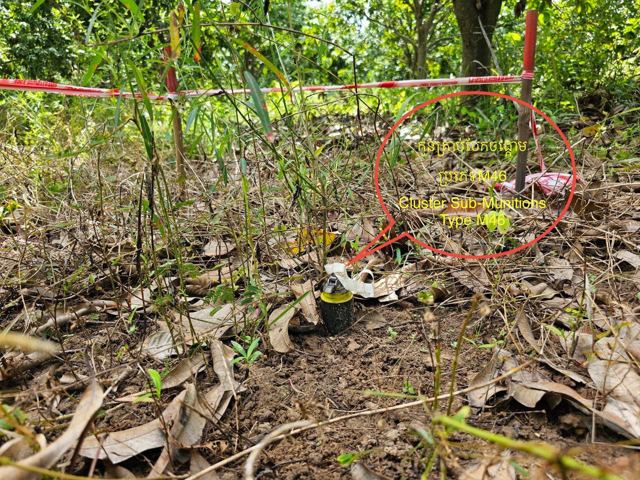 រាជធានីភ្នំពេញ ៖ អង្គភាពស៊ីម៉ាក់បានបង្ហាញរូបភាព និងបញ្ជាក់ជាថ្មីអំពីវត្តមានរបស់កូនគ្រាប់បែកចង្កោមប្រភេទ M46 ដែលជាយុទ្ធភណ្ឌបន្សល់ទុកពីការប្រើប្រាស់របស់យោធាថៃមកលើទឹកដីកម្ពុជាកាលពីពេលកន្លងទៅ។