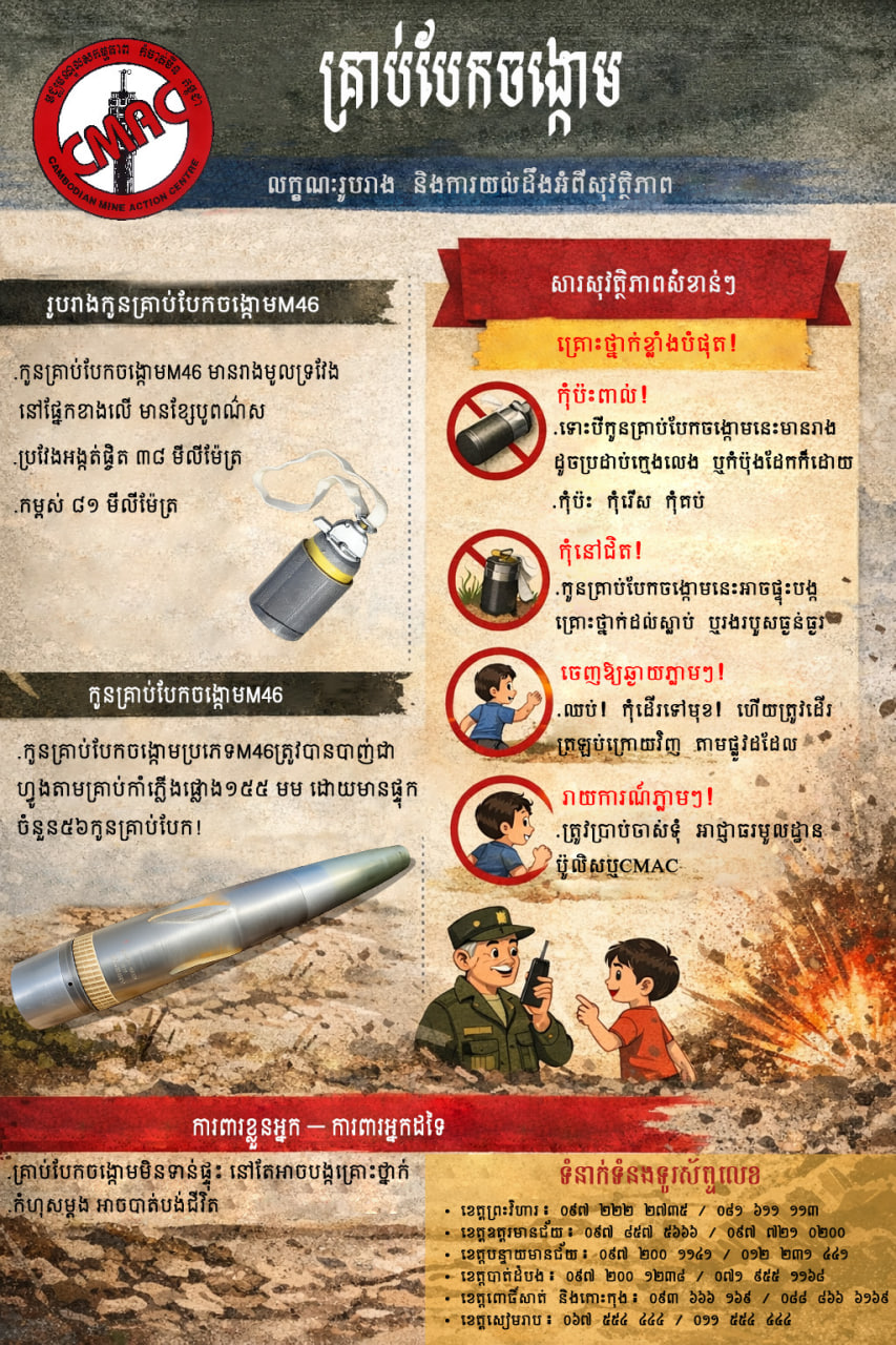 -រាយការណ៍ជាបន្ទាន់៖ ក្នុងករណីរកឃើញ សូមរាយការណ៍ជាប្រញាប់ទៅកាន់អាជ្ញាធរមូលដ្ឋាន ឬទំនាក់ទំនងមកកាន់ អង្គភាពស៊ីម៉ាក់ (CMAC) ដែលនៅជិតលោកអ្នកបំផុត ដើម្បីឱ្យមន្ត្រីជំនាញចុះមកយកចេញ ឬកម្ទេចចោលដោយសុវត្ថិភាព៕
