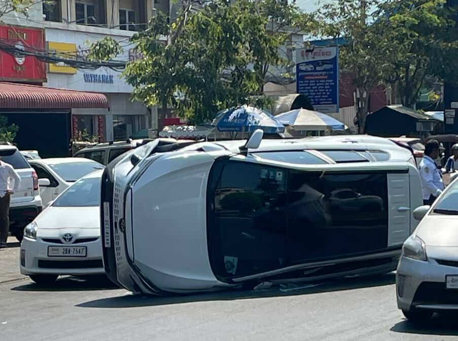 រាជធានីភ្នំពេញ ៖ រថយន្តម៉ាក Toyota Corolla Cross មួយគ្រឿងបានបើកជ្រុលចង្កូតទៅបុករថយន្តម៉ាក prius កំពុងឈប់បណ្ដាលឲ្យក្រឡាប់ខ្លួនឯងហើយរថយន្តទាំងពីរគ្រឿងបានរងការខូចខាត។