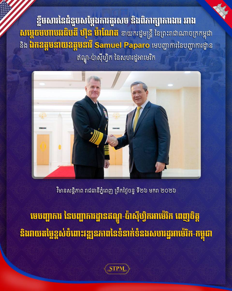 ការថ្លែងរបស់សម្តេចមហាបវរធិបតីនេះដែរ ក្នុងឱកាសដែលសម្តេចបានអនុញ្ញាតឱ្យឯកឧត្តម នាយឧត្តមនាវី Samuel Paparo មេបញ្ជាការនៃបញ្ជាការដ្ឋានឥណ្ឌូ-ប៉ាស៊ីហ្វិក នៃសហរដ្ឋអាម៉េរិក ចូលជួបសម្តែងការគួរសម និងពិភាក្សាការងារ នៅវិមានសន្តិភាព ។