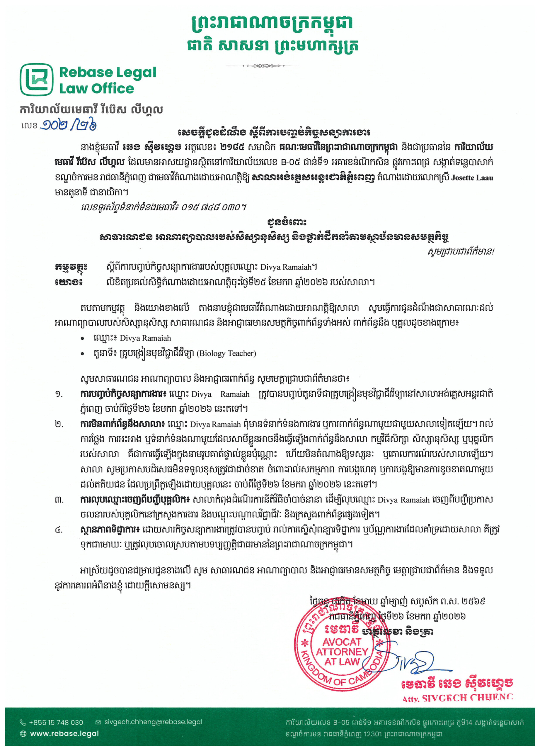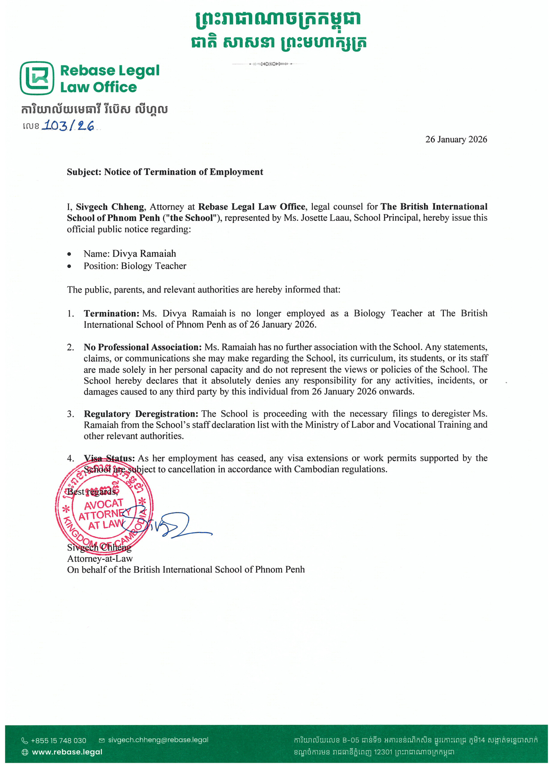 រាជធានីភ្នំពេញ ៖ សេចក្ដីជូនដំណឹង ស្តីពីការបញ្ចប់កិច្ចសន្យាការងារ ៕