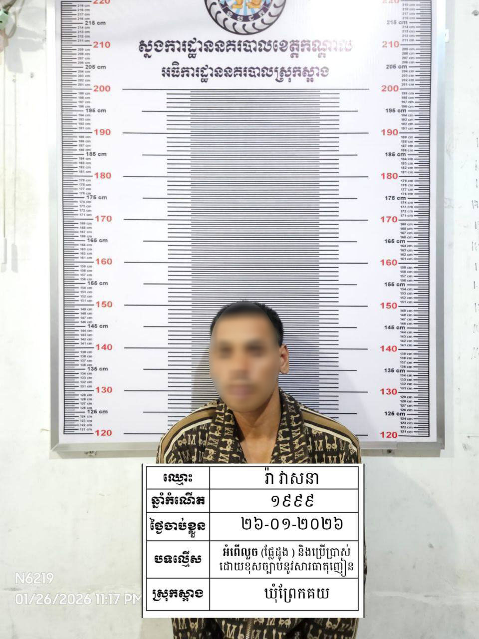 ជនសង្ស័យមានឈ្មោះ រ៉ា វាសនា ភេទ ប្រុសអាយុ ២៧ឆ្នាំ ជនជាតិខ្មែរ មុខរបរ មិនពិតប្រាកដ មានទីលំនៅភូមិ ត្រពាំងឈូក ឃុំព្រែកគយ ស្រុកស្អាង ខេត្តកណ្តាល។ ធ្លាប់ជាប់ពន្ឋនាគាខេត្តកណ្តាល ចំនួន០១លើក ពីបទលួច(ដែក) និងមានសារធាតុញៀនក្នុងខ្លួន ។