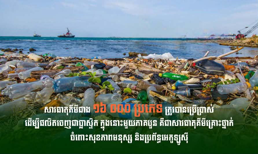 រាជធានីភ្នំពេញ ៖ សារធាតុគីមីជាង ១៦,០០០ប្រភេទ ត្រូវបានប្រើប្រាស់ ដើម្បីផលិតចេញជាផលិតផលប្លាស្ទិក ក្នុងនោះមួយភាគបួន គឺជាសារធាតុគីមីគ្រោះថ្នាក់ ចំពោះសុខភាពមនុស្ស និងប្រព័ន្ធអេកូឡូស៊ី នេះបើតាមការអ្នកនាំពាក្យក្រសួងបរិស្ថាន ។