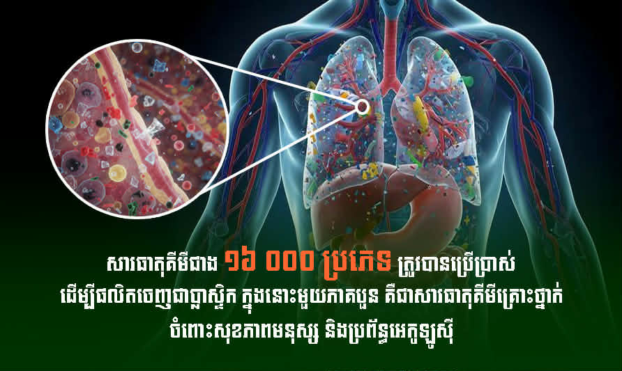 អ្នកនាំពាក្យ បន្តថា យោងតាមមូលដ្ឋានទិន្នន័យសកល ចេញផ្សាយកាលពីពេលថ្មីៗ ដោយកម្មវិធីឈ្មោះ PlastChem និងបានដកស្រង់ផ្សាយ ដោយអគ្គនាយកដ្ឋានទទួលបន្ទុកបរិស្ថាន នៃសហភាពអឺរ៉ុប បានឱ្យដឹងថា ក្នុងចំណោមសារធាតុគីមីចម្រុះ ដែលអាចកំណត់អត្តសញ្ញាណបាន សម្រាប់ប្រើប្រាស់ក្នុងការផលិតជាប្លាស្ទិក អ្នកវិទ្យាសាស្ត្របានរកឃើញសារធាតុគីមីគ្រោះថ្នាក់ រហូតដល់មួយភាគបួនរួចទៅហើយ។ វាក៏កំពុងត្រូវបានប្រើប្រាស់ និងបោះចោលទៅក្នុងបរិស្ថាន និងកំពុងបង្កគ្រោះថ្នាក់បំផុត ចំពោះសុខភាពមនុស្ស និងប្រព័ន្ធអេកូឡូស៊ី ។