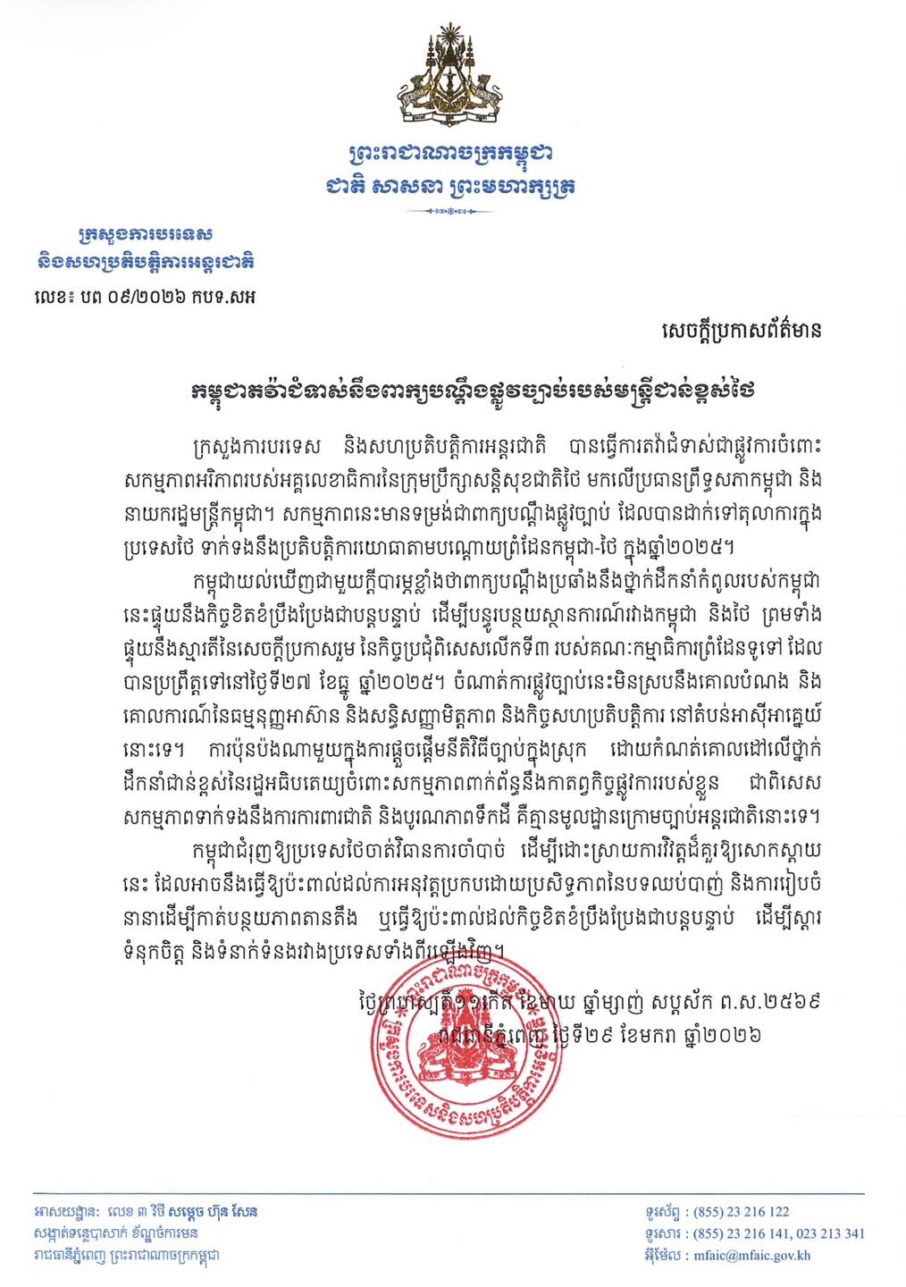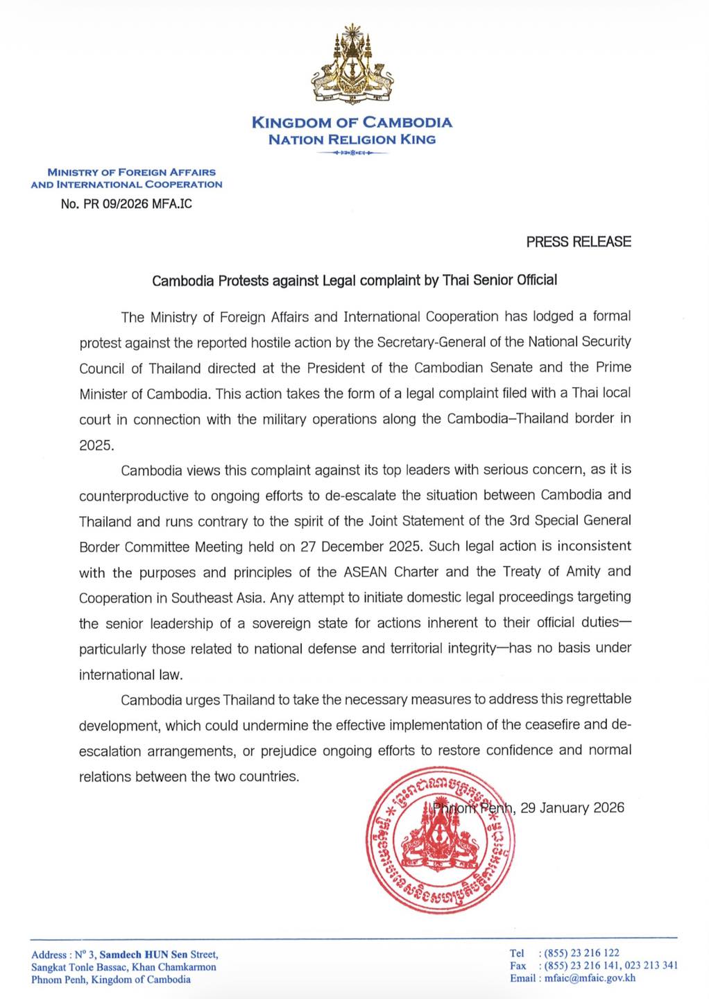 កម្ពុជាយល់ឃើញជាមួយក្តីបារម្ភខ្លាំងថា ពាក្យបណ្ដឹងប្រឆាំងនឹងថ្នាក់ដឹកនាំកំពូលរបស់កម្ពុជា នេះផ្ទុយនឹងកិច្ចខិតខំប្រឹងប្រែងជាបន្តបន្ទាប់ ដើម្បីបន្ធូរបន្ថយស្ថានការណ៍រវាងកម្ពុជា និងថៃ ព្រមទាំង ផ្ទុយនឹងស្មារតីនៃសេចក្តីប្រកាសរួម នៃកិច្ចប្រជុំពិសេសលើកទី៣ របស់គណៈកម្មាធិការព្រំដែនទូទៅ ដែលបានប្រព្រឹត្តទៅនៅថ្ងៃទី២៧ ខែធ្នូ ឆ្នាំ២០២៥ ។