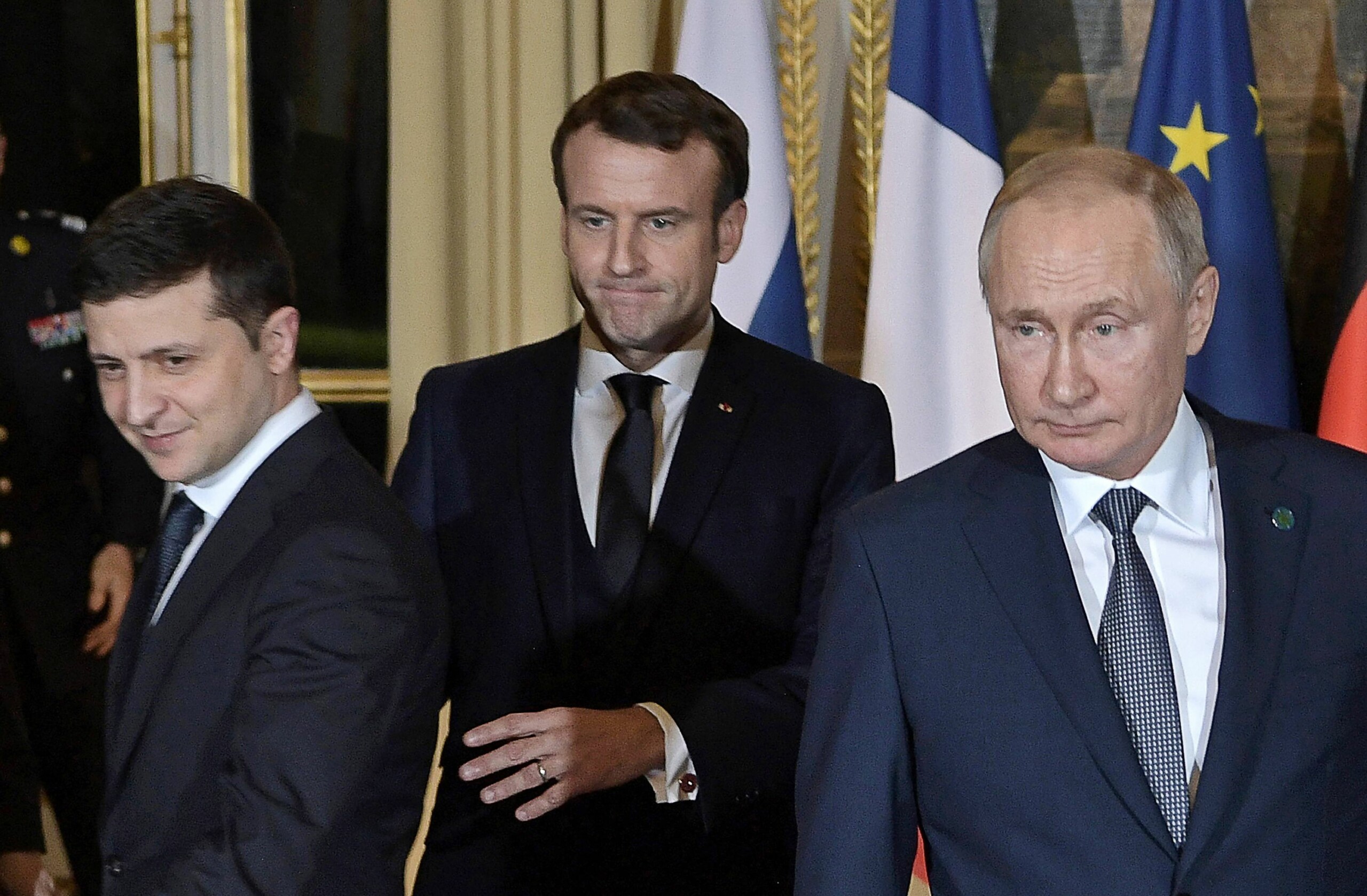 PARIS, FRANCE DECEMBER 9, 2019: Ukraine’s President Volodymyr Zelenskyy (Vladimir Zelensky), France’s President Emmanuel Macron, and Russia’s President Vladimir Putin (L-R) attend a Normandy Four summit in the Murat Lounge in the Elysee Palace; talks in the so-called Normandy Four format involve representatives of Ukraine, Germany, France and Russia who discuss settlement of the conflict in eastern Ukraine. Alexei Nikolsky/Russian Presidential Press and Information Office/TASS/Sipa USA/28410006/DF/1912092340 ចំណែករុស្ស៊ីវិញអះអាងថា មិនដែលបដិសេធឡើយគោលការណ៍នៃការជួបគ្នាបែបនោះ តែដោយលើកលក្ខខណ្ឌឲ្យលោកហ្សេឡេនស្គីមកកាន់រុស្ស៊ី ។ វិមានក្រឹមឡាំងក៏អះអាងដែរថា ត្រៀមធានាសន្តិសុខ និងបណ្ដាលក្ខខណ្ឌការងារសមស្រប ក្នុងករណីលោកហ្សេឡេនស្គីមកកាន់ក្រុងមូស្គូ ។ នេះបើតាមសេចក្ដីរាយការណ៍របស់កាសែតអ៊ុយក្រែន KIYV INDEPENDENT ។
