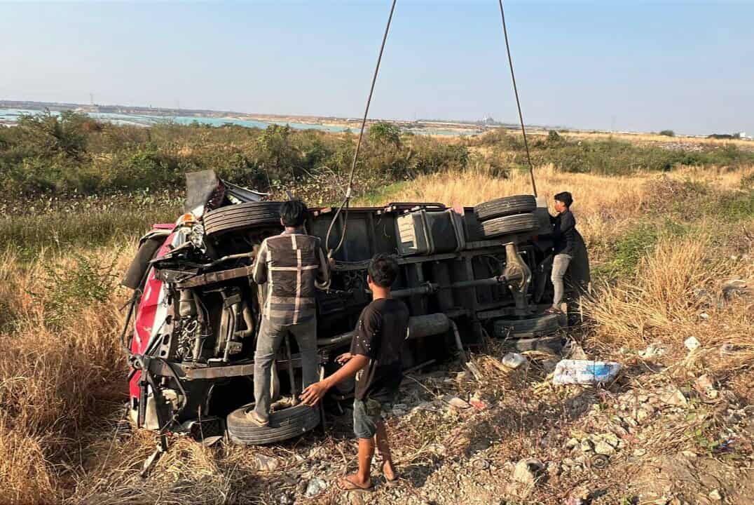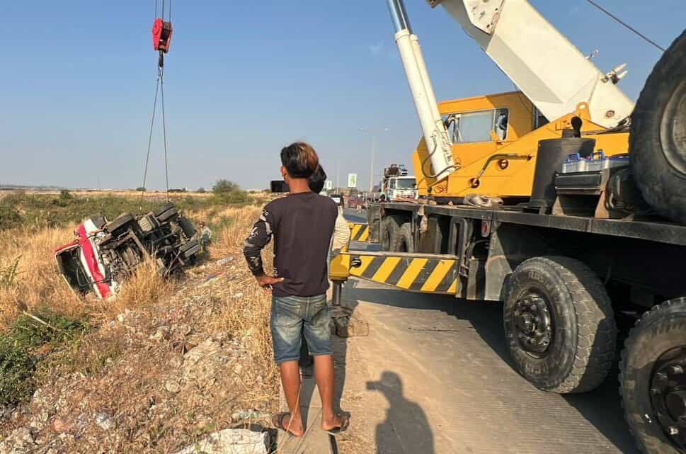 រថយន្តដែលជ្រុលចង្កូតធ្លាក់ផ្លូវក្រឡាប់ ម៉ាកហ៊ីយ៉ាន់ដាយ ដឹកទឹកកក ពណ៌ក្រហម ពាក់ស្លាកលេខភ្នំពេញ 3F-1079 ។